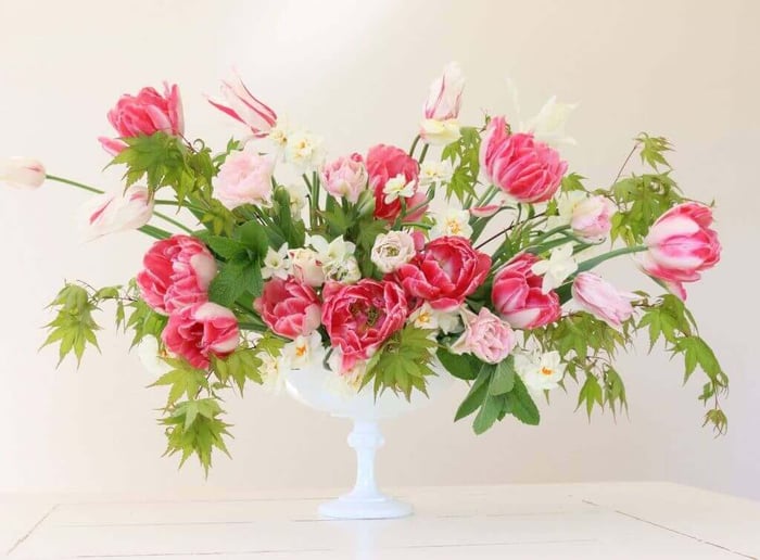 Late-blooming double tulips Angelique and Creme Upstar have the soft, romantic appeal of peonies. Slender, lily-flowered tulip Marilyn is a pleasing contrast. Alicia also added single daffodil Pueblo and double daffodil Cheerfulness for an extra dose of sweetness.