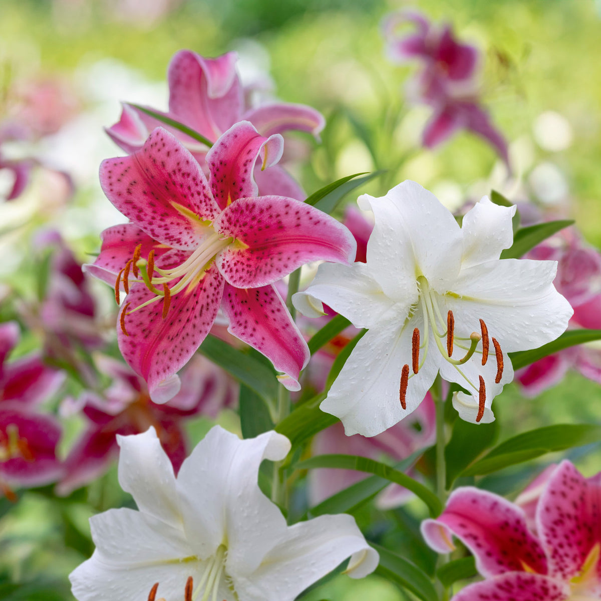 A timeless white-and-pink duo that brings beauty and fragrance to the summer garden. Casa Blanca stuns with enormous, pure white blooms and an elegant, towering form. Stargazer adds bold contrast with vibrant pink petals and rich perfume. Together, they deliver dramatic, long-lasting color and scent to beds and bouquets alike.