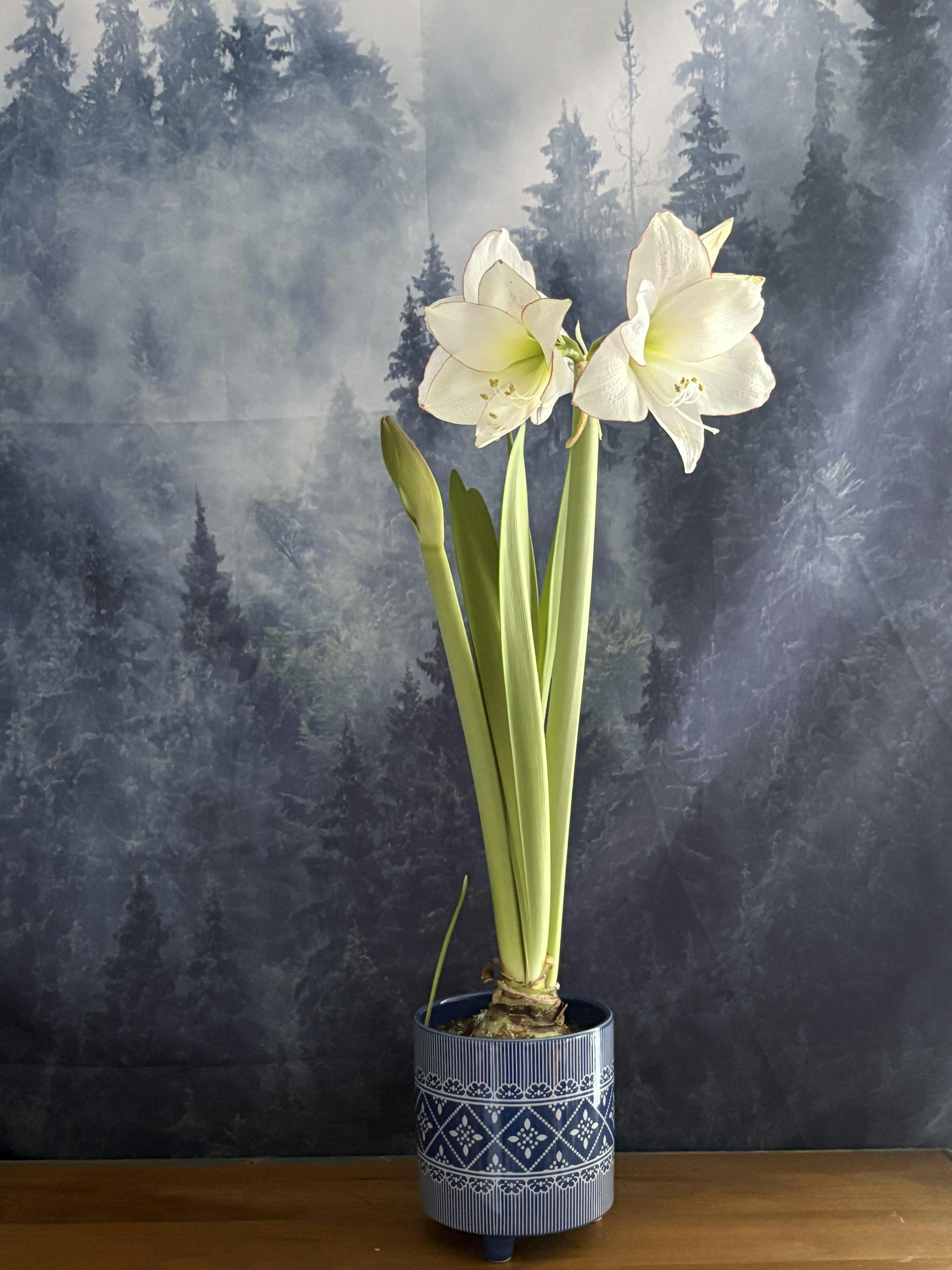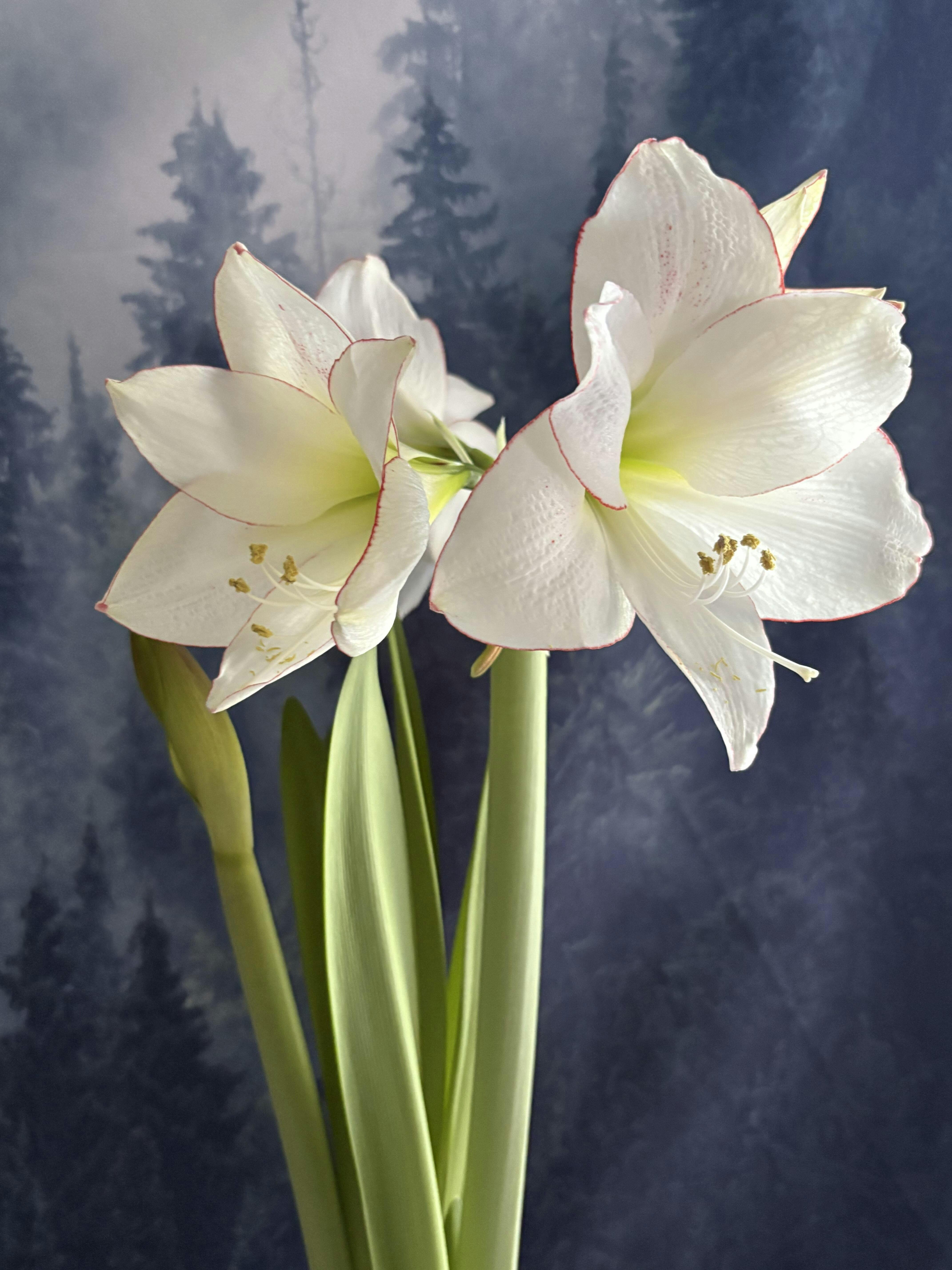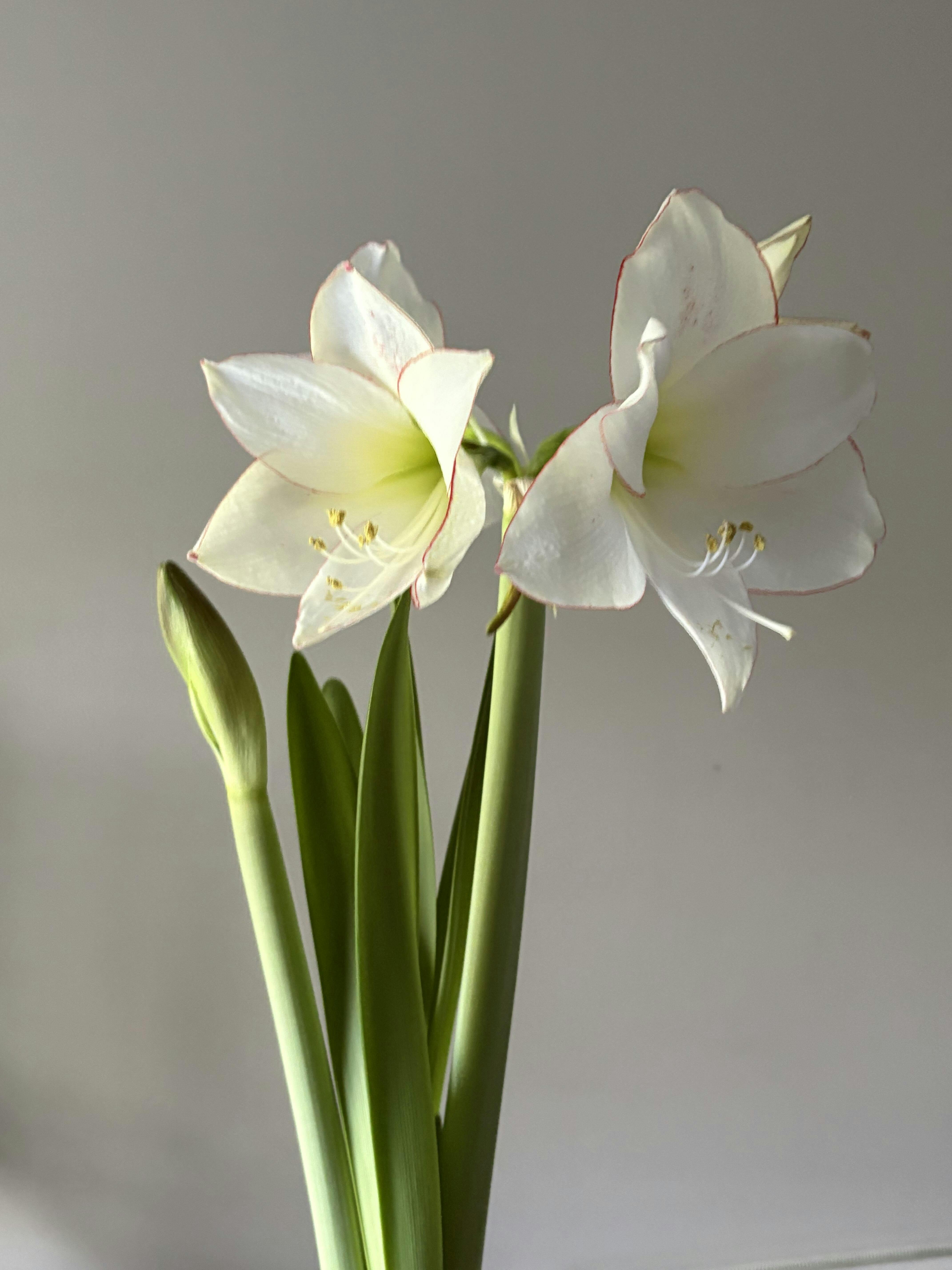 Picotee's exquisite flowers have pure white petals, outlined with an almost impossibly thin red edge. A lime-green center adds to their cool elegance. Amaryllis are long-lasting cut flowers and this variety looks especially lovely in a vase with mixed greens.