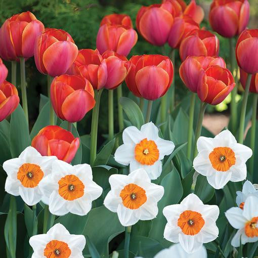 Welcome friends and neighbors to your home with this spirited combination of beautiful spring flowers. The big, red-orange blossoms of Ad Rem tulips are perfectly complemented by daffodil Barrettt Browning's bright orange cups. Both varieties are known for their vigor and dependable performance. Bloom time is mid-spring.