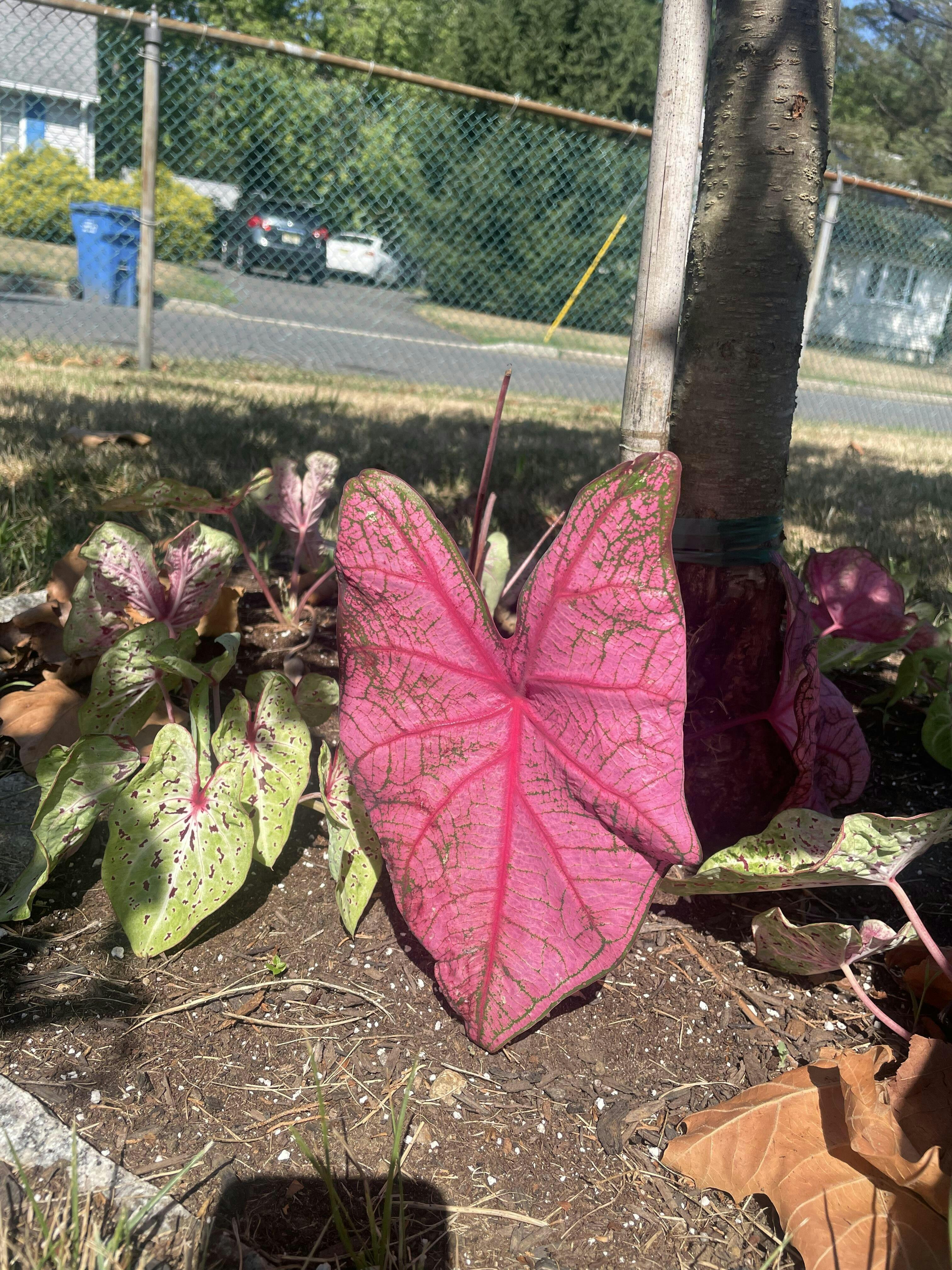Fannie Munson's heart-shaped leaves are bright flamingo pink with dark green trim. Like all caladiums, this variety grows well in full to partial shade. The more shade, the more intense the color. Summer fireworks for shady gardens, patios and landscapes.