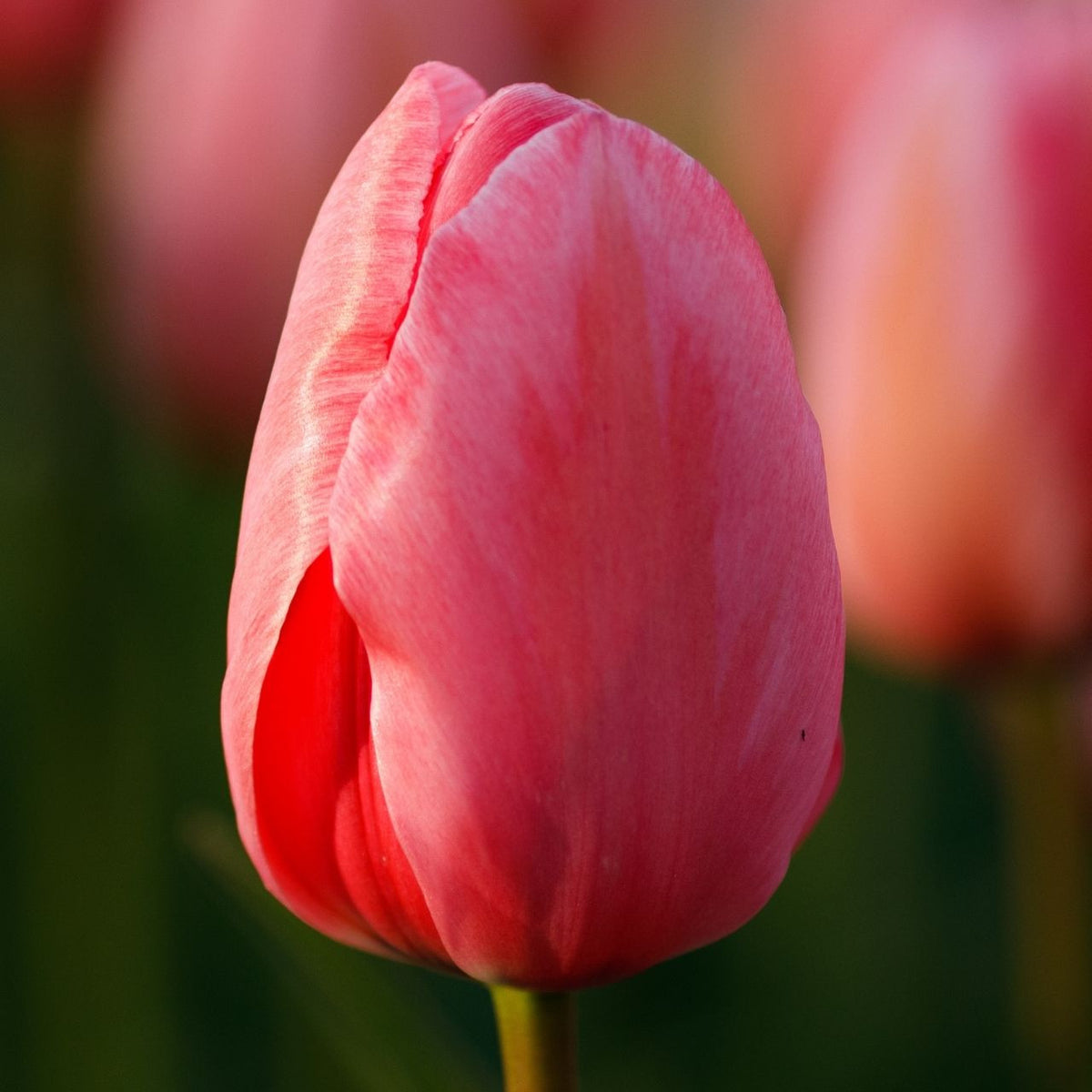 Impression tulips are known for their large, long-lasting flowers, stately presence and vivid colors. Design Impression has a distinctive look. The overall flower color is rose pink, but it shades from dark to light, with the interior of the blossom distinctively deeper in color. Contrasting, golden-orange flames decorate the outer petals. Variegated foliage, too!