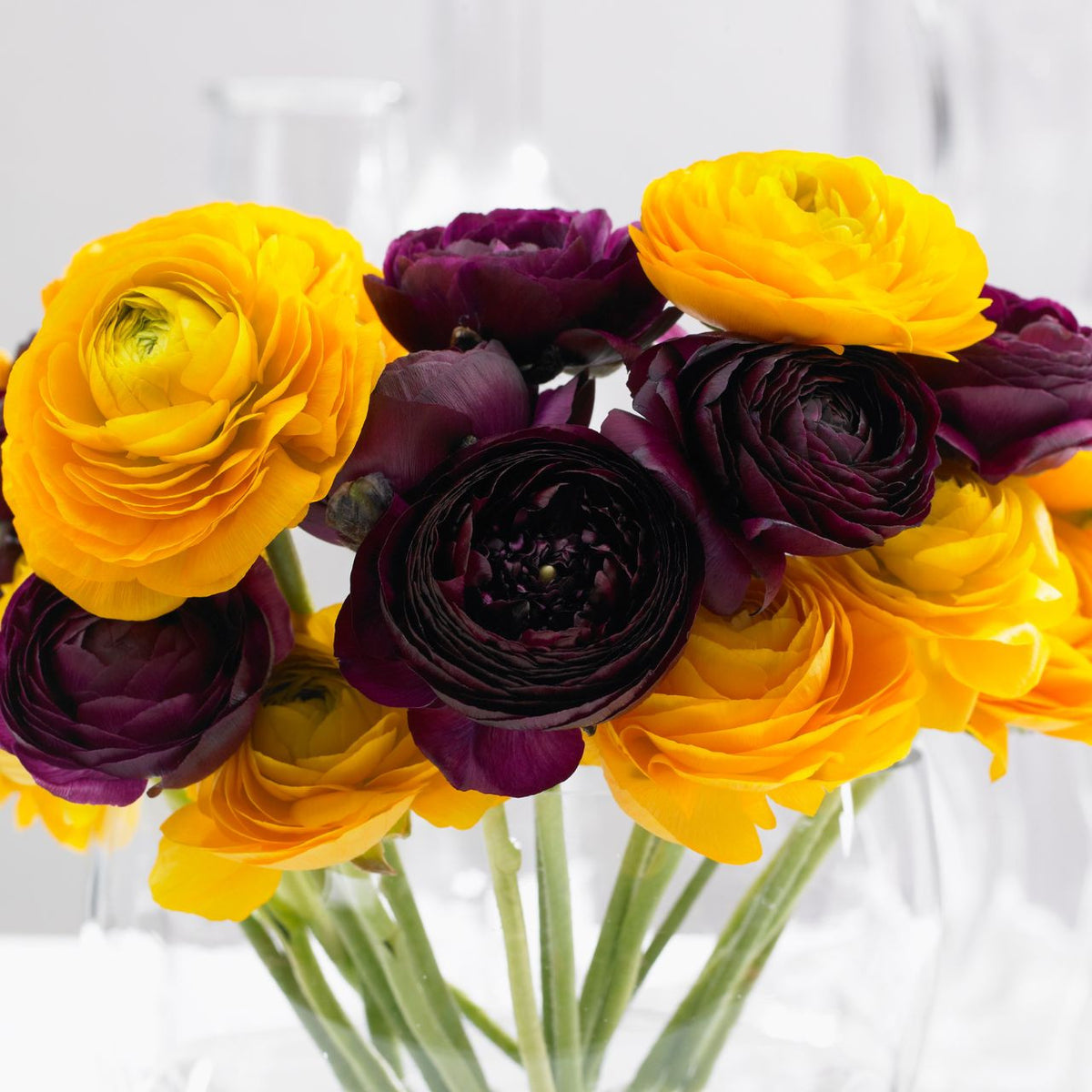 Bright meets bold in this eye-catching combination of Tomer Yellow and Tomer Purple ranunculus. The sunny yellow blooms bring warmth and cheer, while the deep purple adds a rich, dramatic contrast—together they create a stunning display that’s both playful and elegant. These florist-quality flowers have long stems, rose-like layers, and a long vase life, making them ideal for cutting gardens and spring arrangements. In areas with mild winters (zones 8–11), ranunculus are planted in fall for early spring flowers. The plants will not survive freezing temperatures, so be sure to provide protection from extreme cold. In zones 4–7, plant in early spring for late spring to summer blooms.