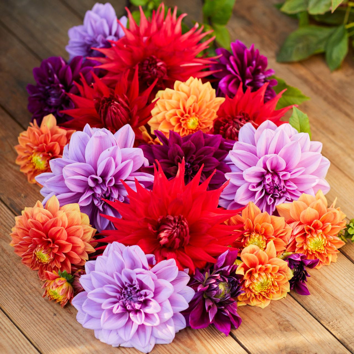 Rev up the color in your flower garden with this assortment of big-blooming dahlias. You'll enjoy a vibrant mix of hues that includes deep purple, fiery red, zingy orange, and cool lavender. These tried-and-true varieties look great together and will elevate all your summer bouquets.