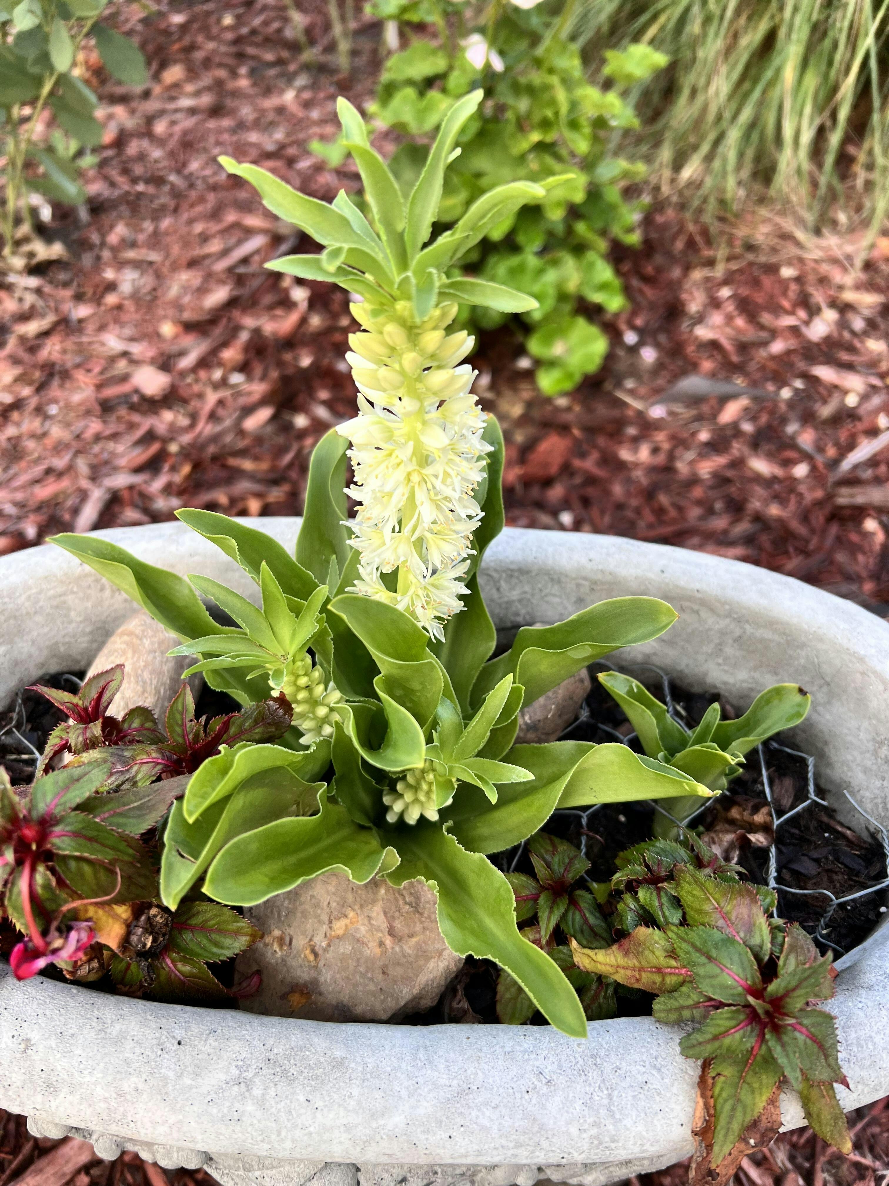 Eucomis autumnalis, also known as pineapple lily, is an easy-to-grow summer-blooming bulb with spikes of creamy white flowers that are topped with a cluster of lime green leaves. The flowers open slowly from the bottom up and are followed by decorative seed heads. Something new and different for your garden beds and containers.