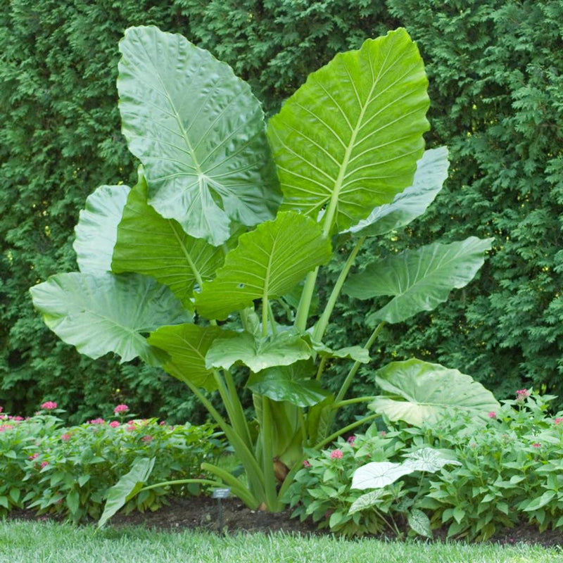 Alocasia and colocasia are better known as elephant ears. These impressive, tropical plants are prized for their dramatic foliage. The leaves can measure up to 2 feet across, with foliage colors ranging from lime green to almost black. Grow them in the garden or in a large container. They also combine beautifully with other summer bulbs and annuals.
