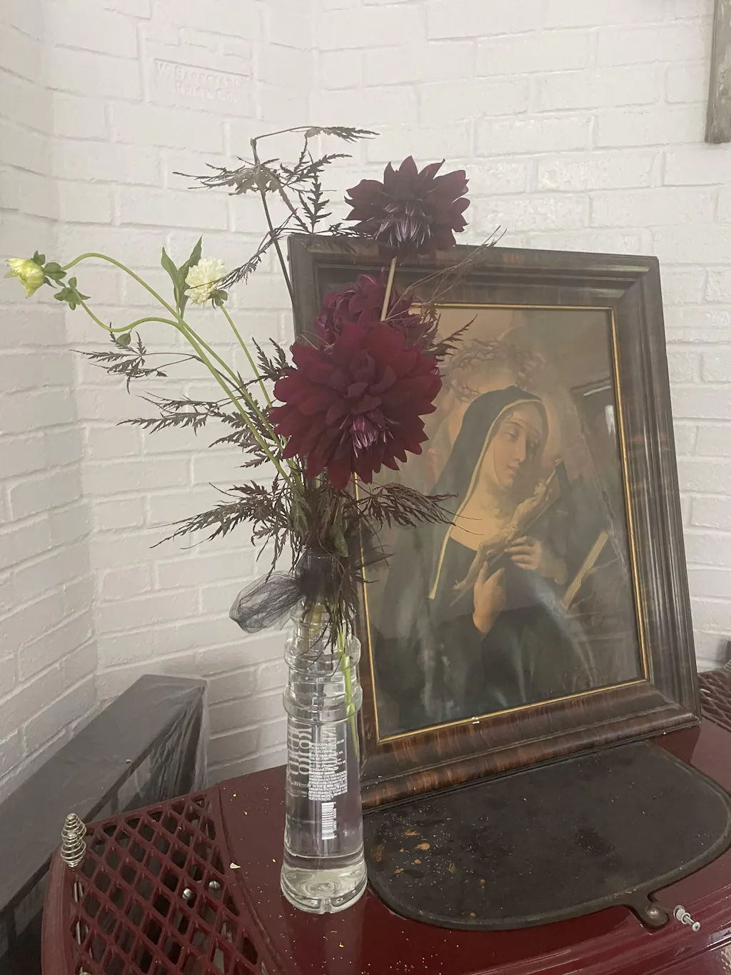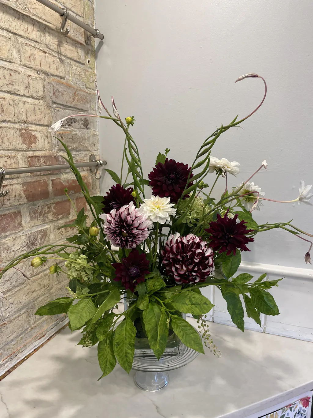 This elegant floral arrangement was created by floral designer Alicia Schwede of Flirtyfleurs.com. The flowers were grown in her own home garden, with bulbs provided by Longfield Gardens. The combination of frosty white and dark burgundy creates a look that's dramatic, yet serene. This collection includes three dahlia varieties, plus the fragrant, late summer flowers of Acidanthera.