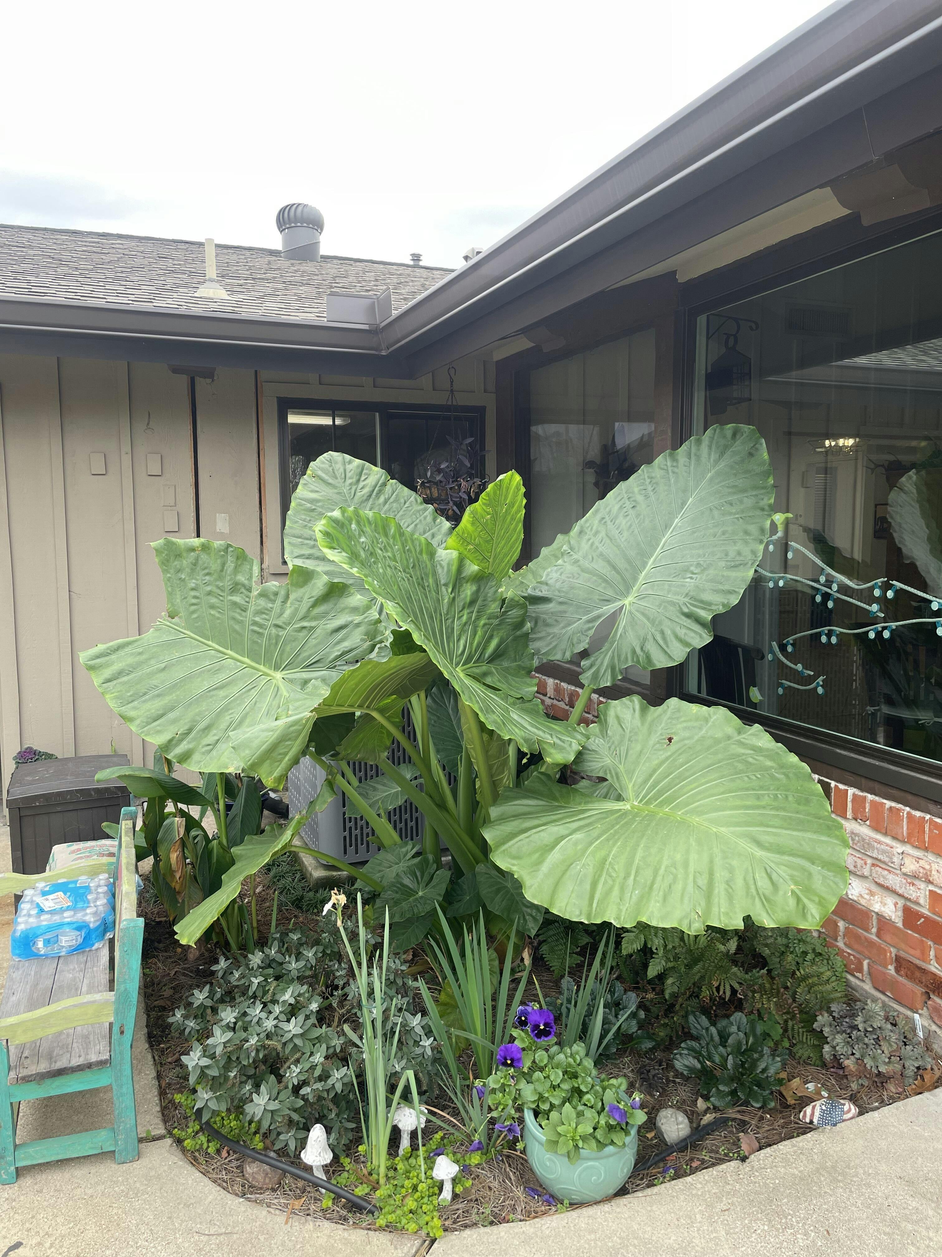 Commonly known as upright elephant ear, Alocasia macrorrhiza's glossy, bright green leaves add an exotic look to beds, borders and pots. The big paddle-shaped leaves are held upright to shed water and make room for companion plants below. These heat-loving tropical plants can grow 5 feet tall in one summer.