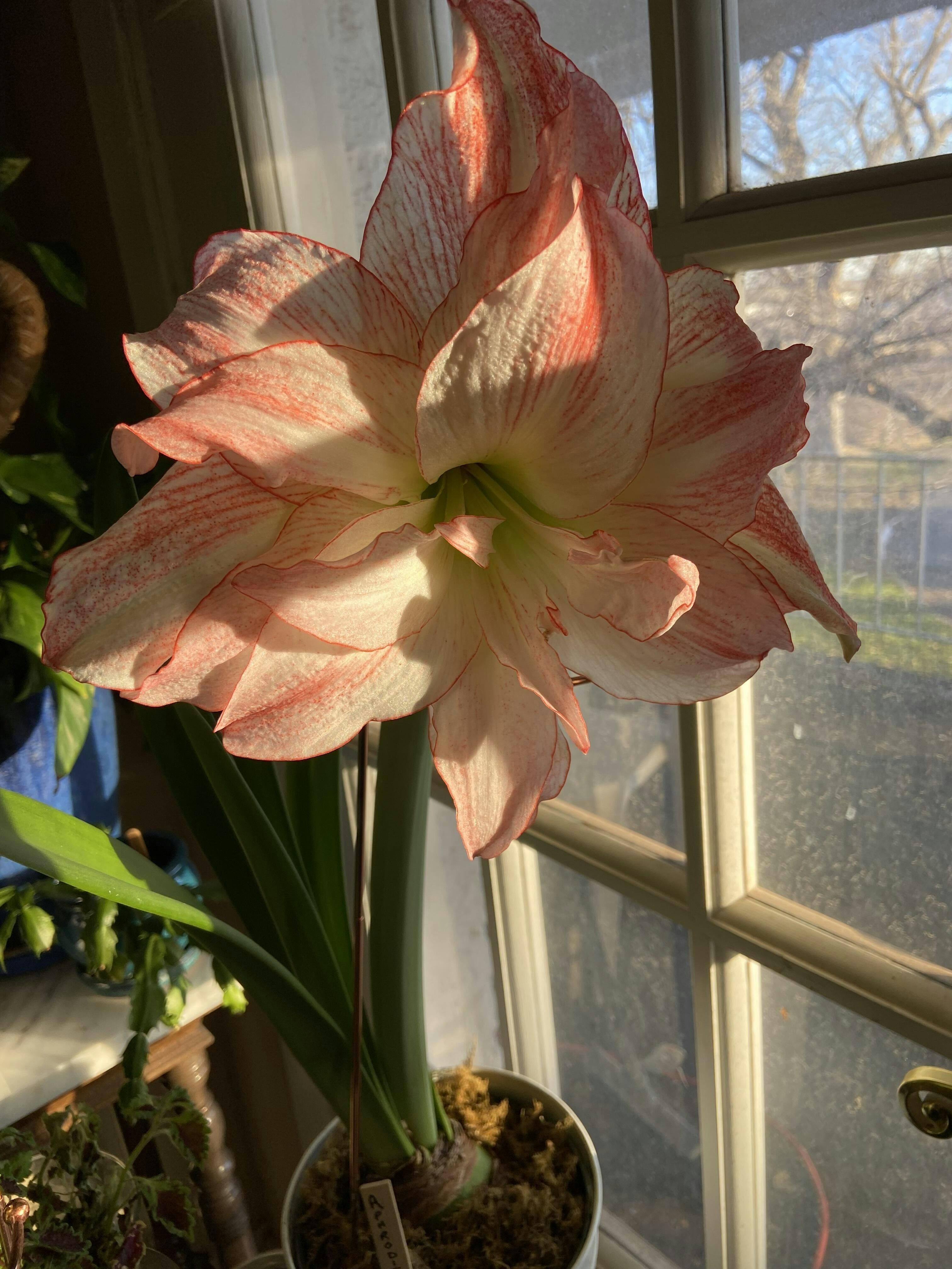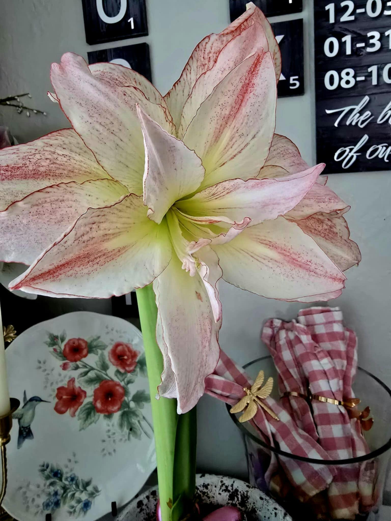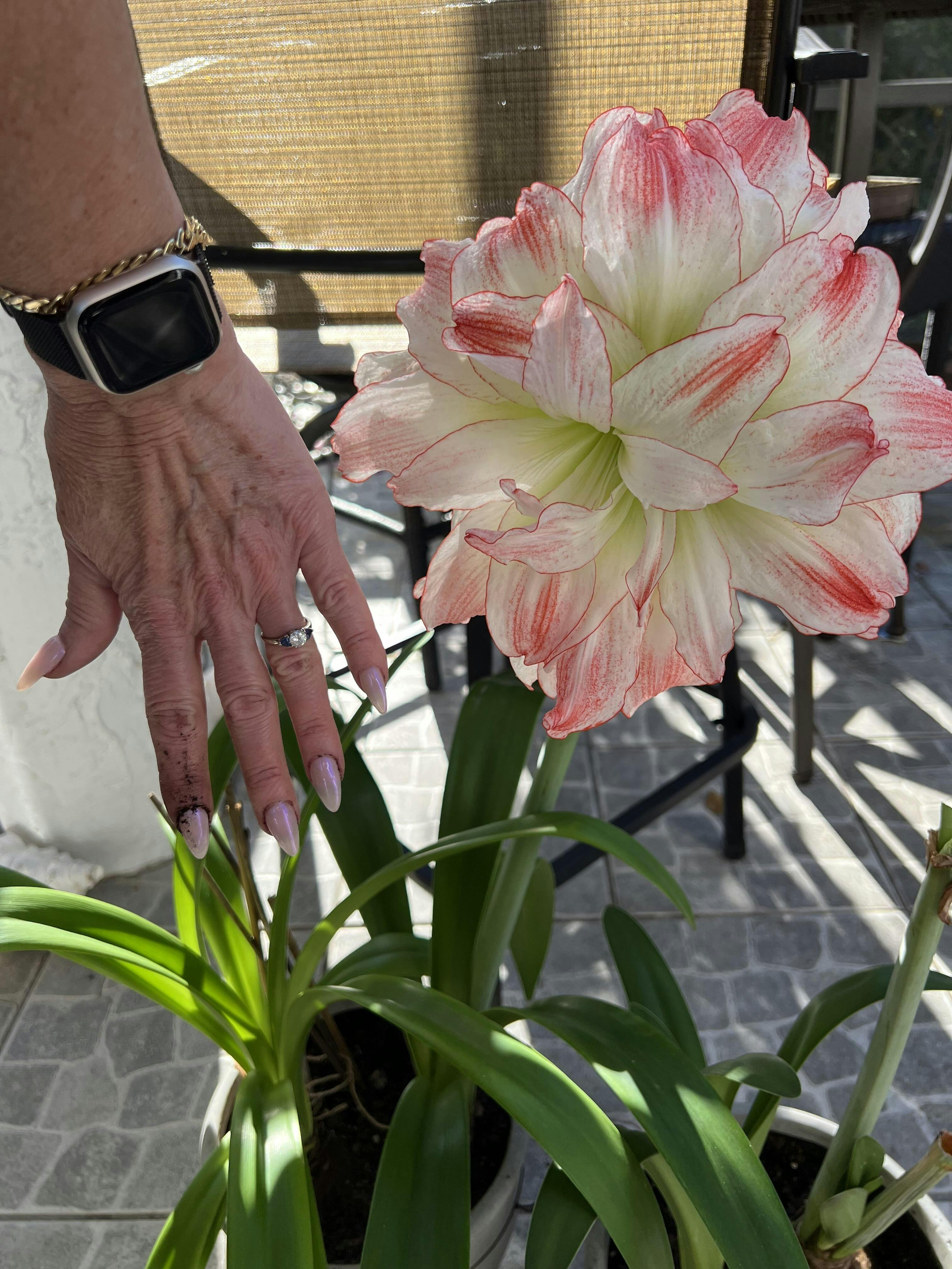 Named for Aphrodite, the Greek goddess of love, this beautiful double amaryllis has ruffled white petals and an apple green center. Each petal is edged in red and decorated with a tracery of fine brushstrokes. You can expect weeks of color with 3 stems and up to a dozen flowers.