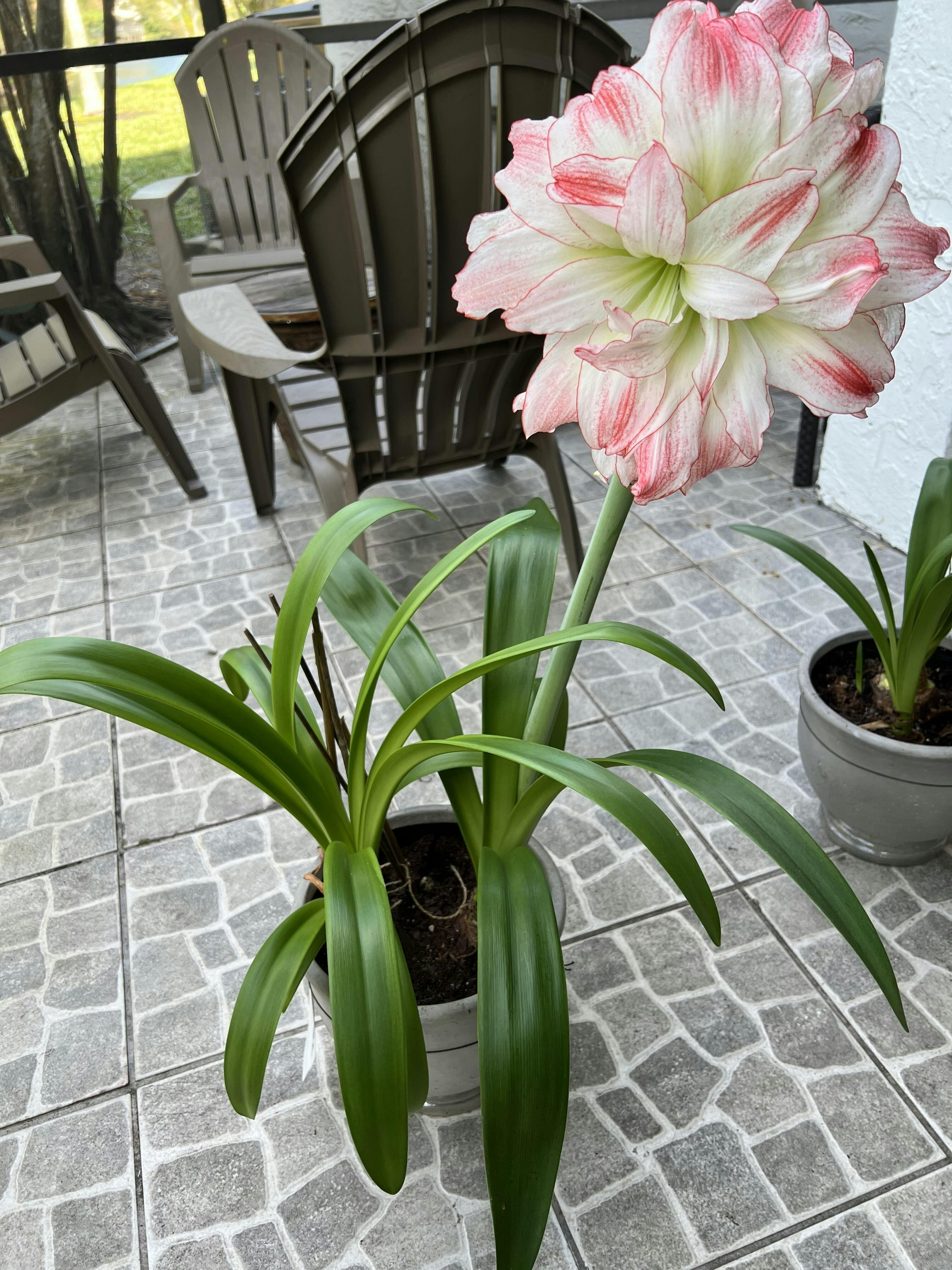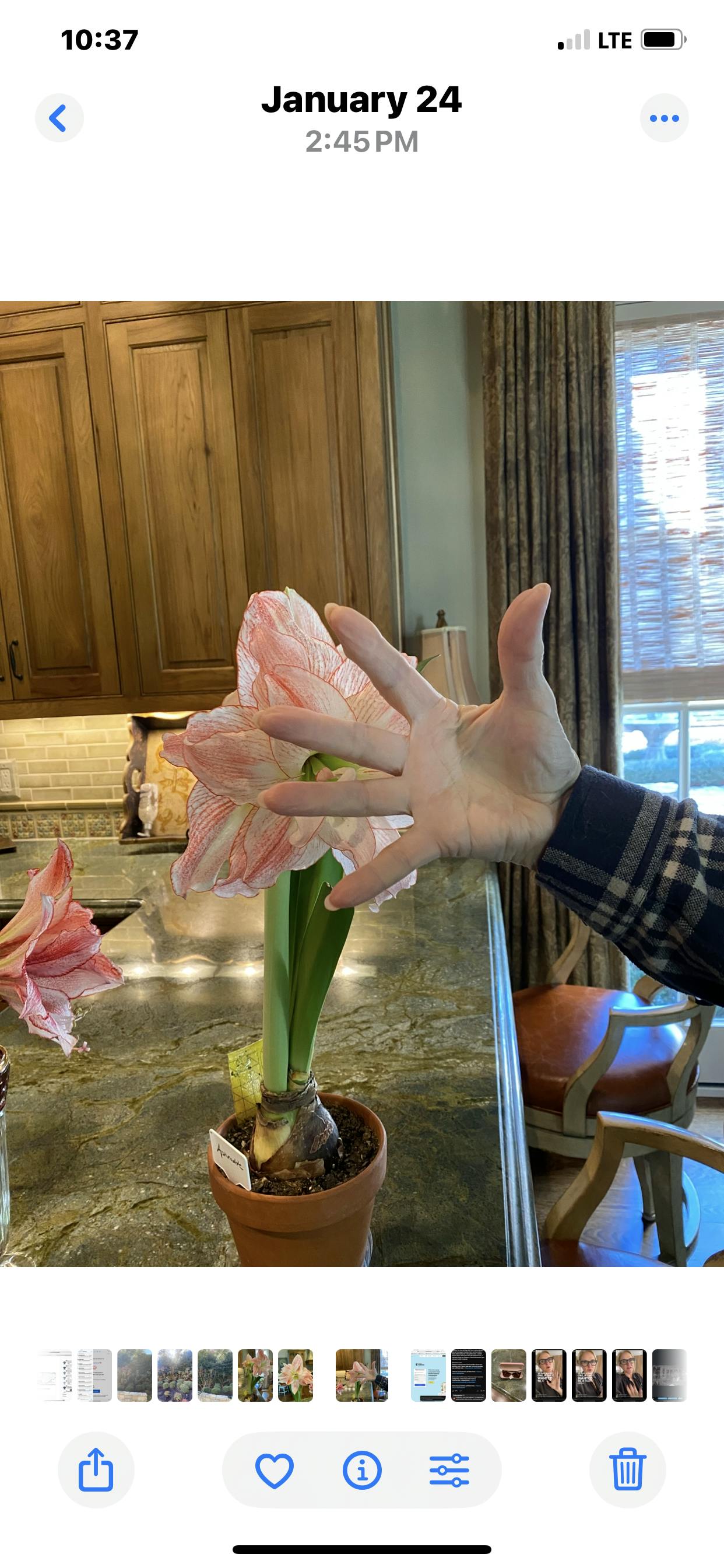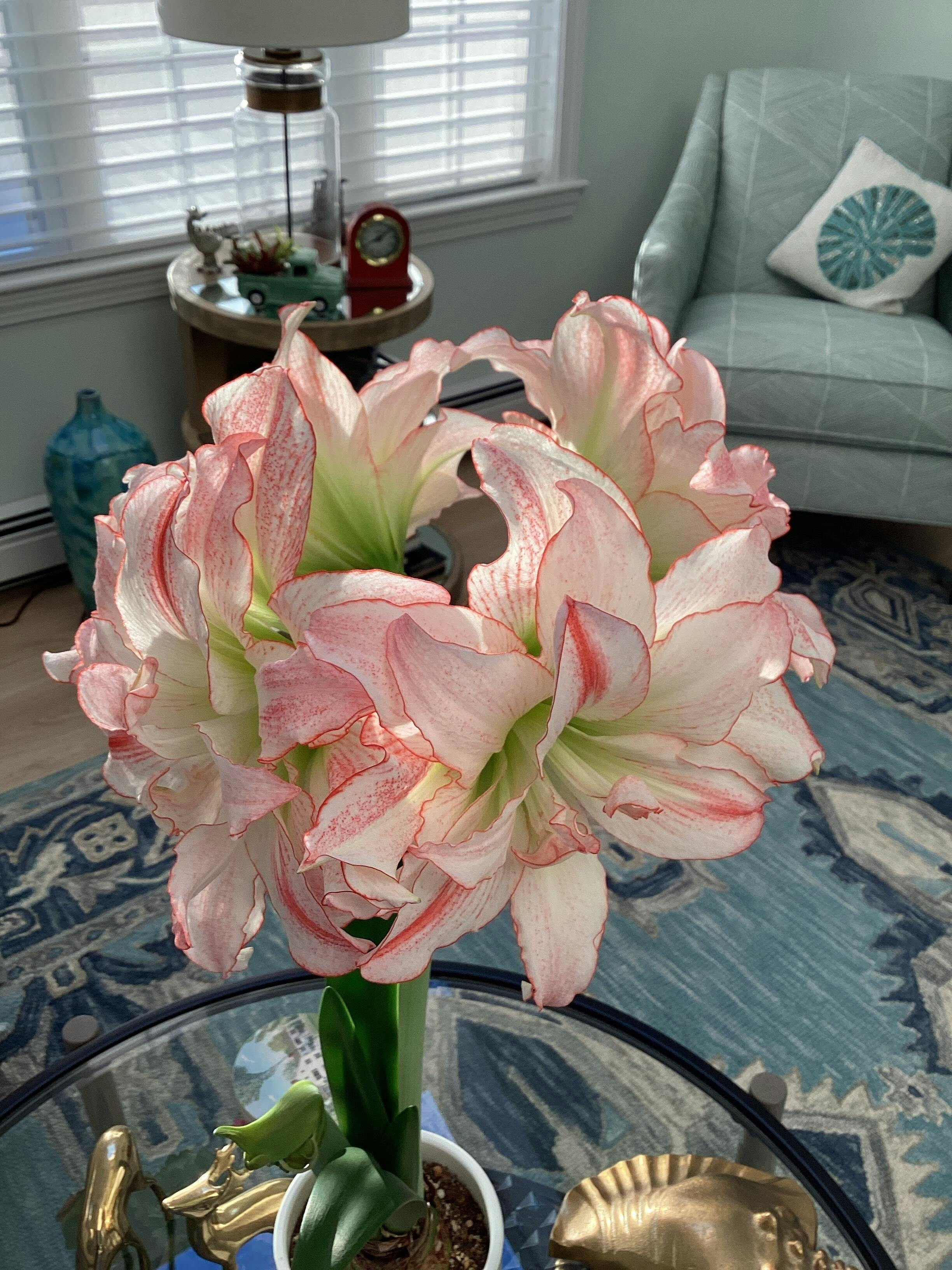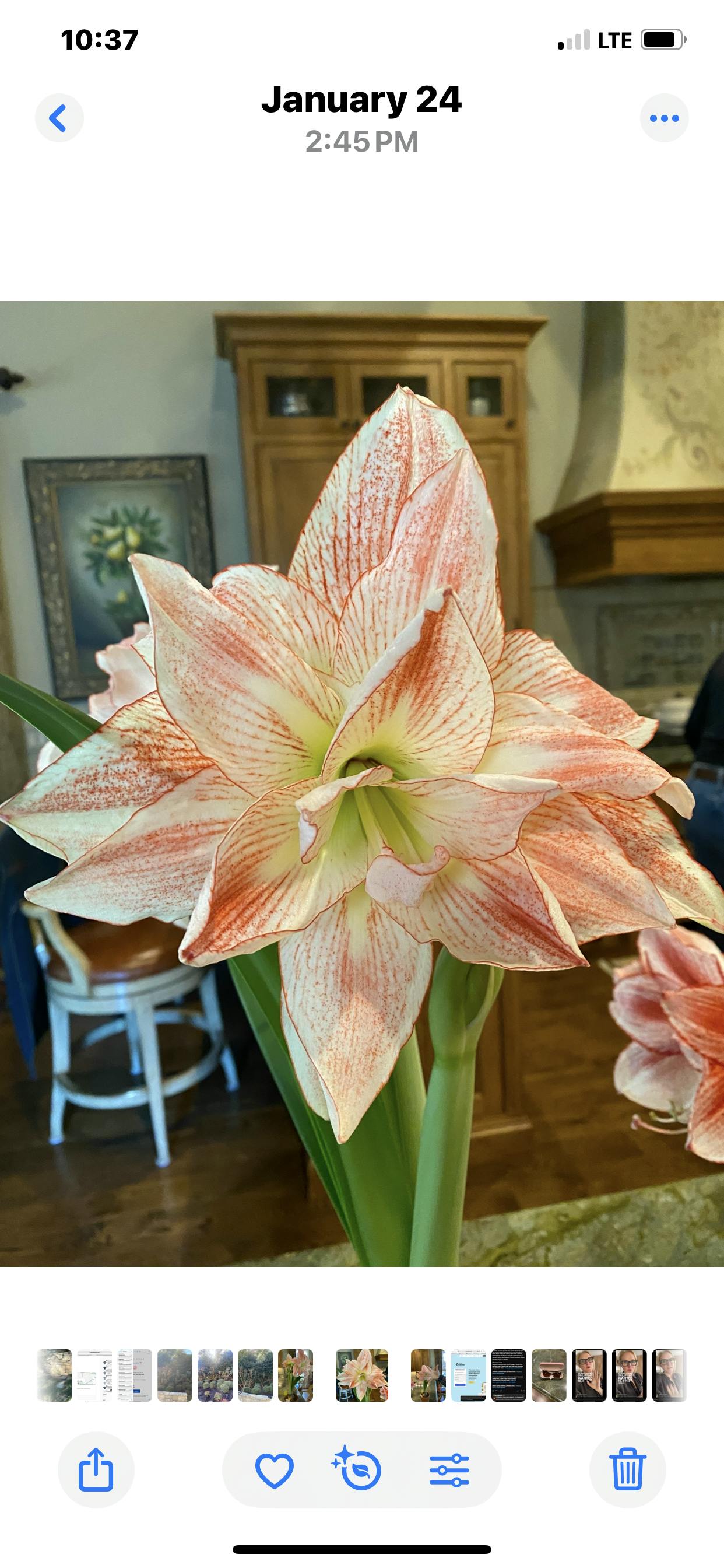 Named for Aphrodite, the Greek goddess of love, this beautiful double amaryllis has ruffled white petals and an apple green center. Each petal is edged in red and decorated with a tracery of fine brushstrokes. You can expect weeks of color with 3 stems and up to a dozen flowers.