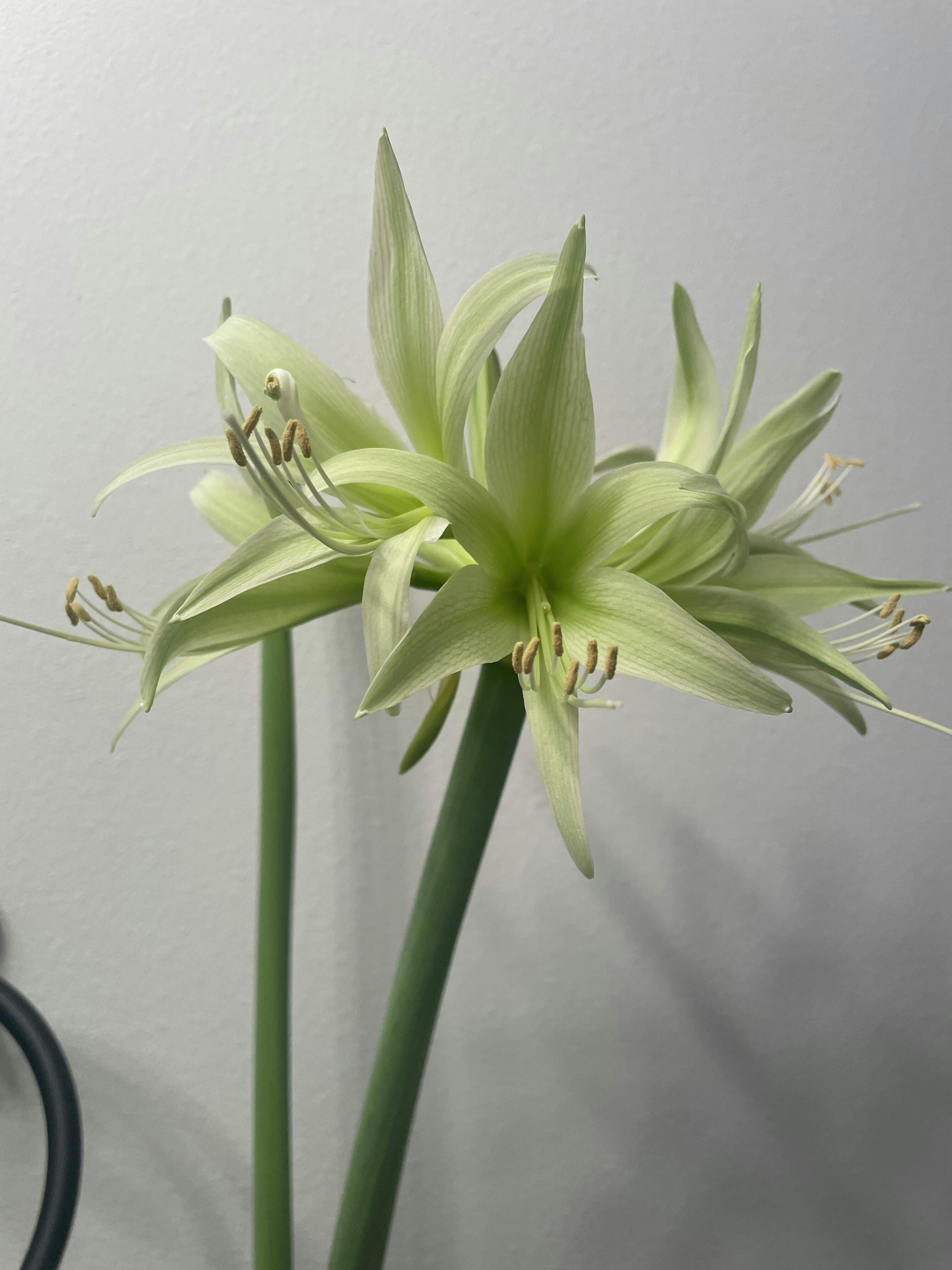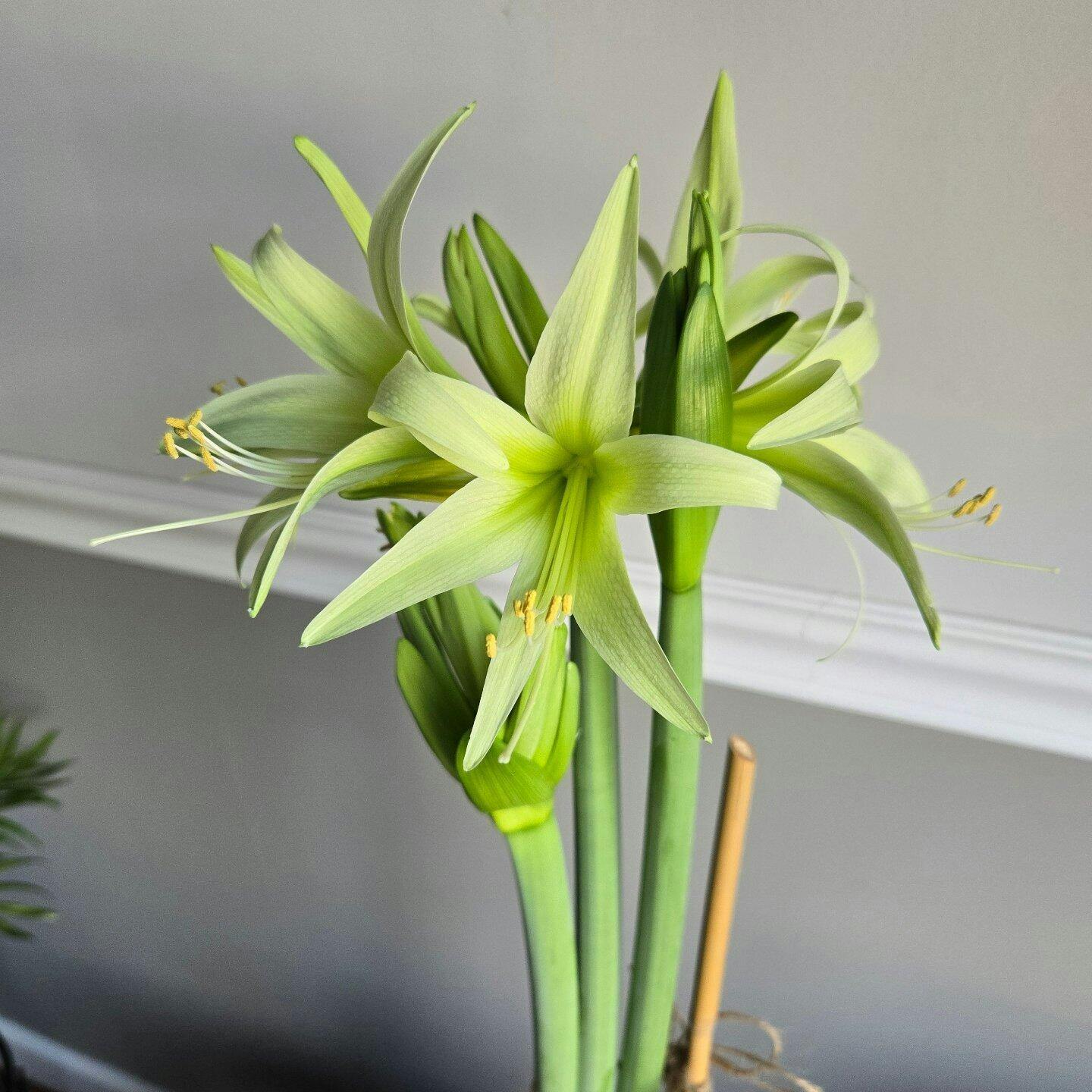 A new look for amaryllis. Evergreen's long, narrow petals and mint-green color give it a fresh, modern appeal. Each bulb will give you 3 stems topped with a bouquet of 4 to 6 flowers. Plant in a decorative pot or plan to cut the stems and enjoy them in a vase.