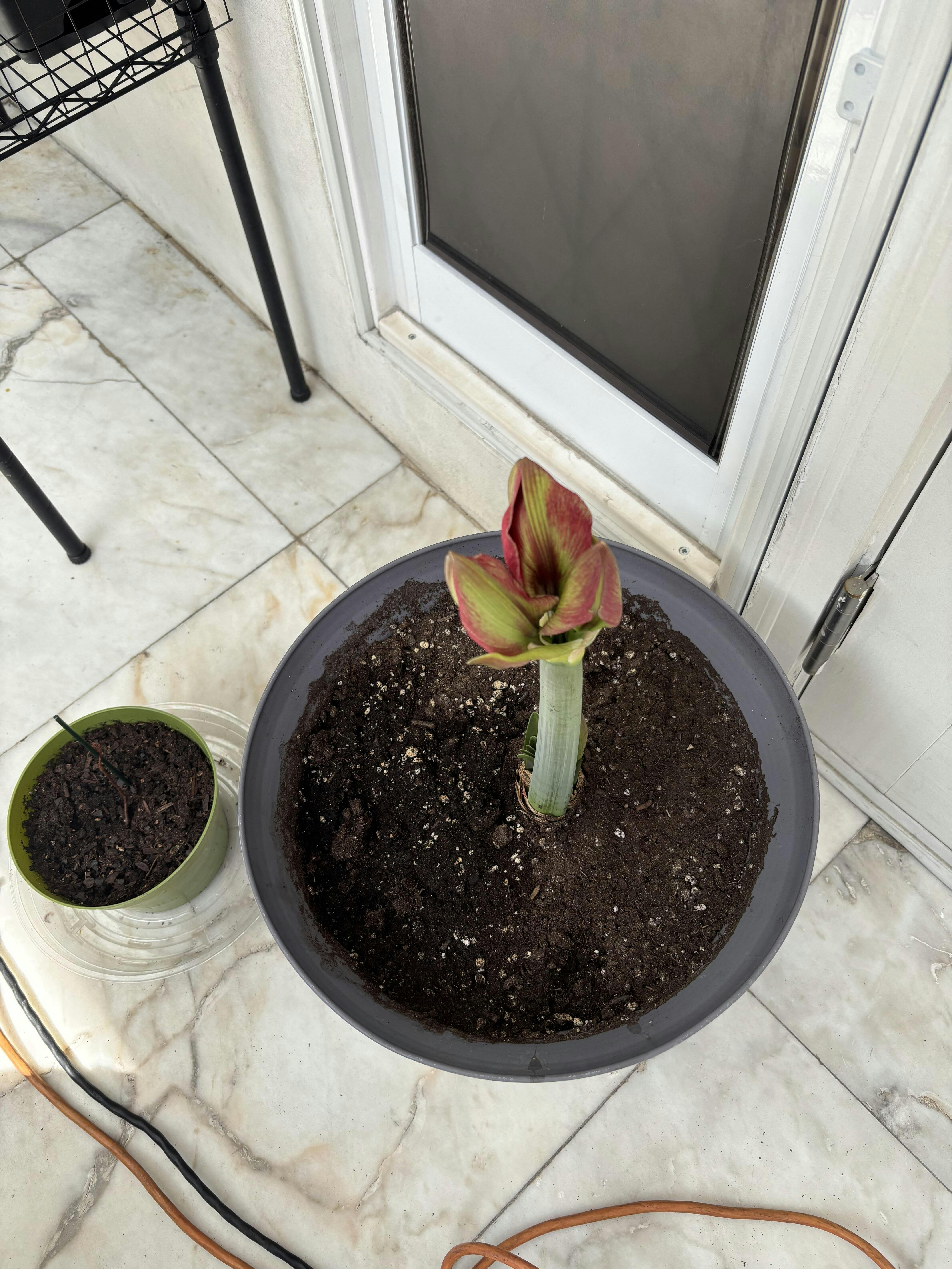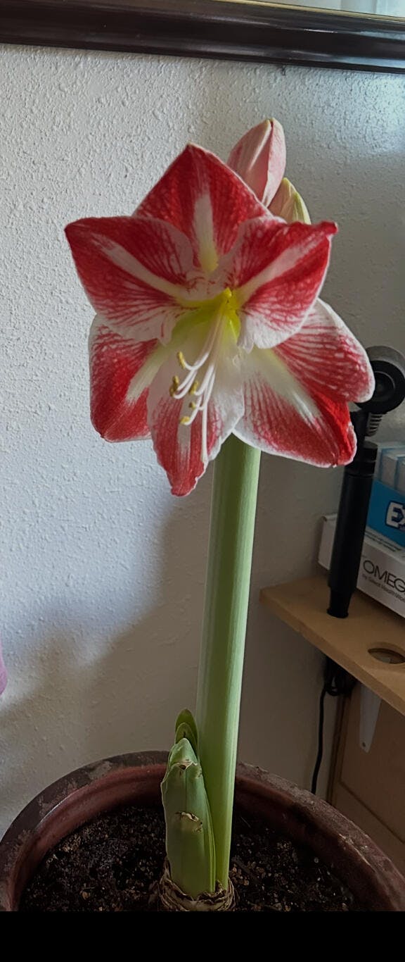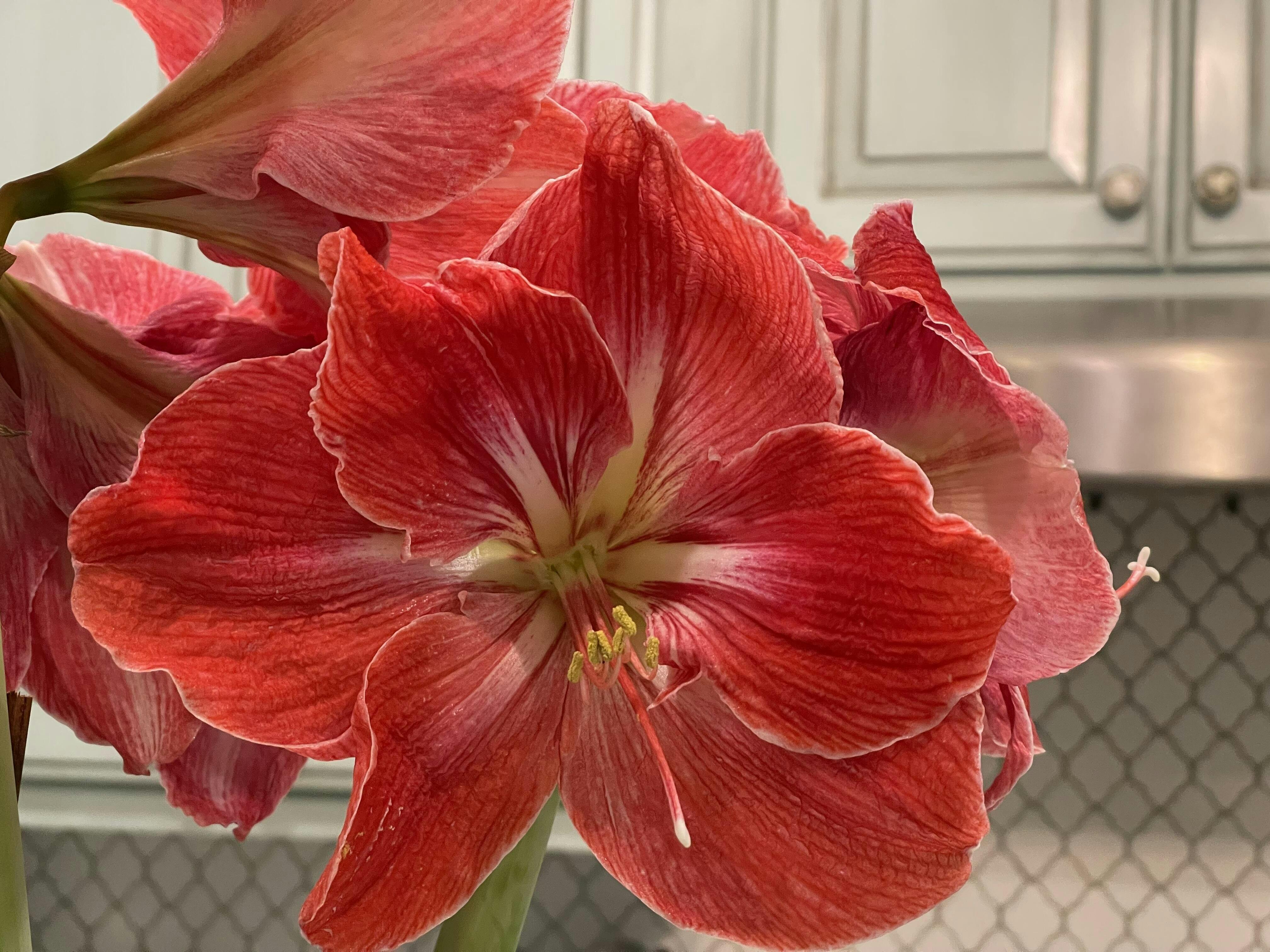 Forget what you know about red amaryllis and prepare to be enchanted by this one. The flowers of Magical Touch are more flat than trumpet-like, and remind us of a pansy's, sweet, open face. The lightly ruffled petals are bright, cherry red with white edges. At the center is a green and white star.