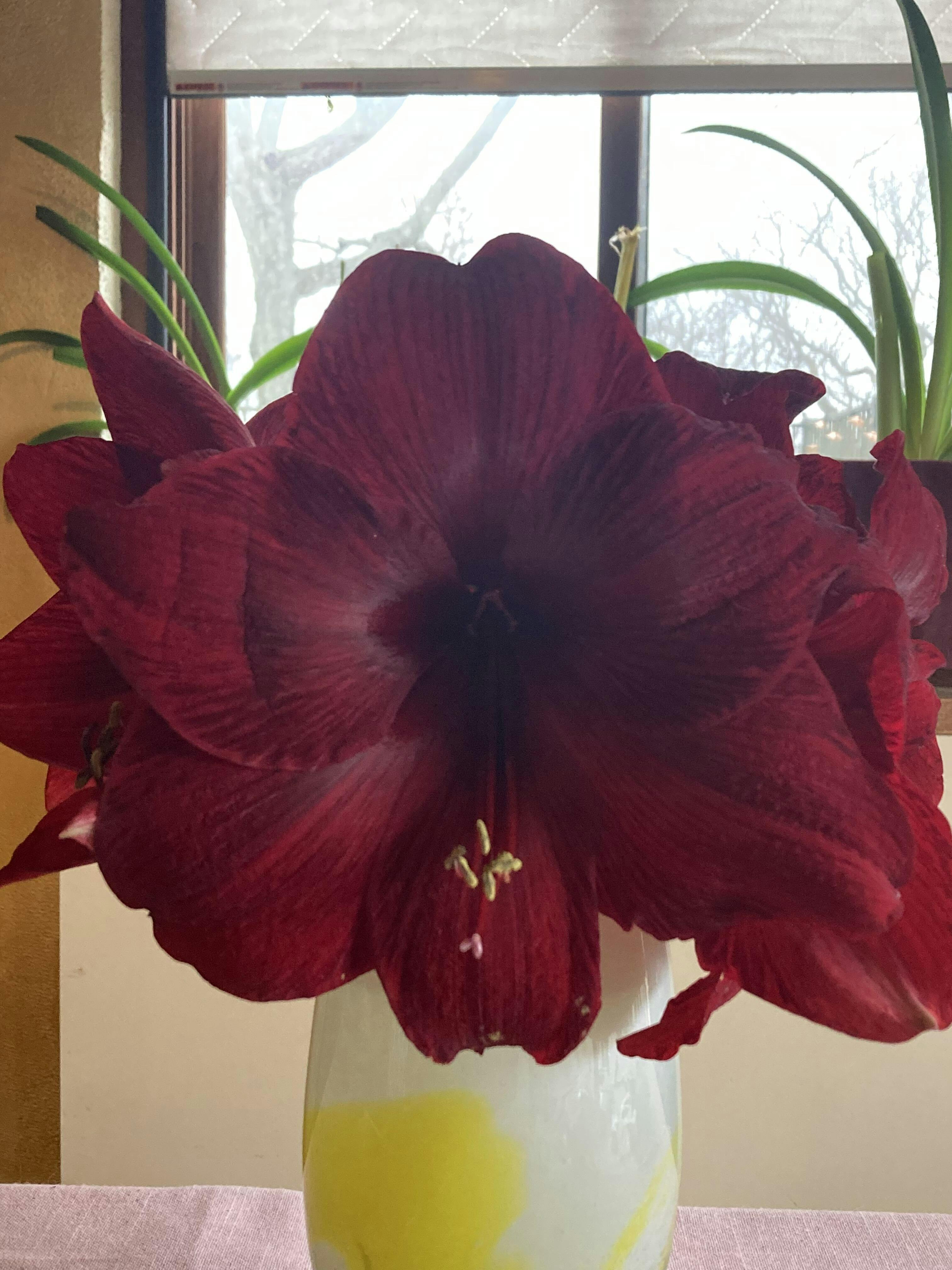 Red Pearl is richer and darker in color than any other amaryllis. Its broad, velvety petals are deep crimson, overlaid with burgundy and maroon. Glittering golden stamens complete the picture. Regal in color and impressive in size, with enormous flowers that often measure 7-8" across. Each bulb will give you 3 stems with 4 to 5 flowers per stem.
