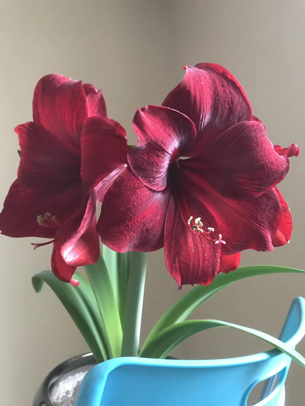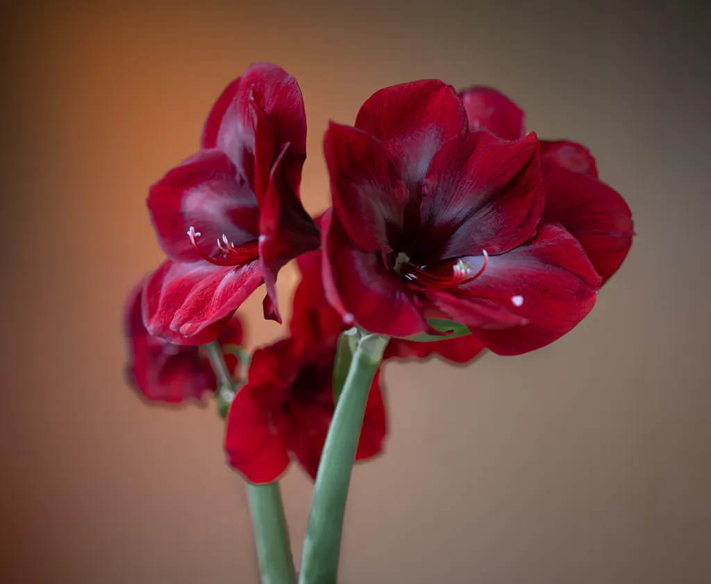 Red Pearl is richer and darker in color than any other amaryllis. Its broad, velvety petals are deep crimson, overlaid with burgundy and maroon. Glittering golden stamens complete the picture. Regal in color and impressive in size, with enormous flowers that often measure 7-8" across. Each bulb will give you 3 stems with 4 to 5 flowers per stem.