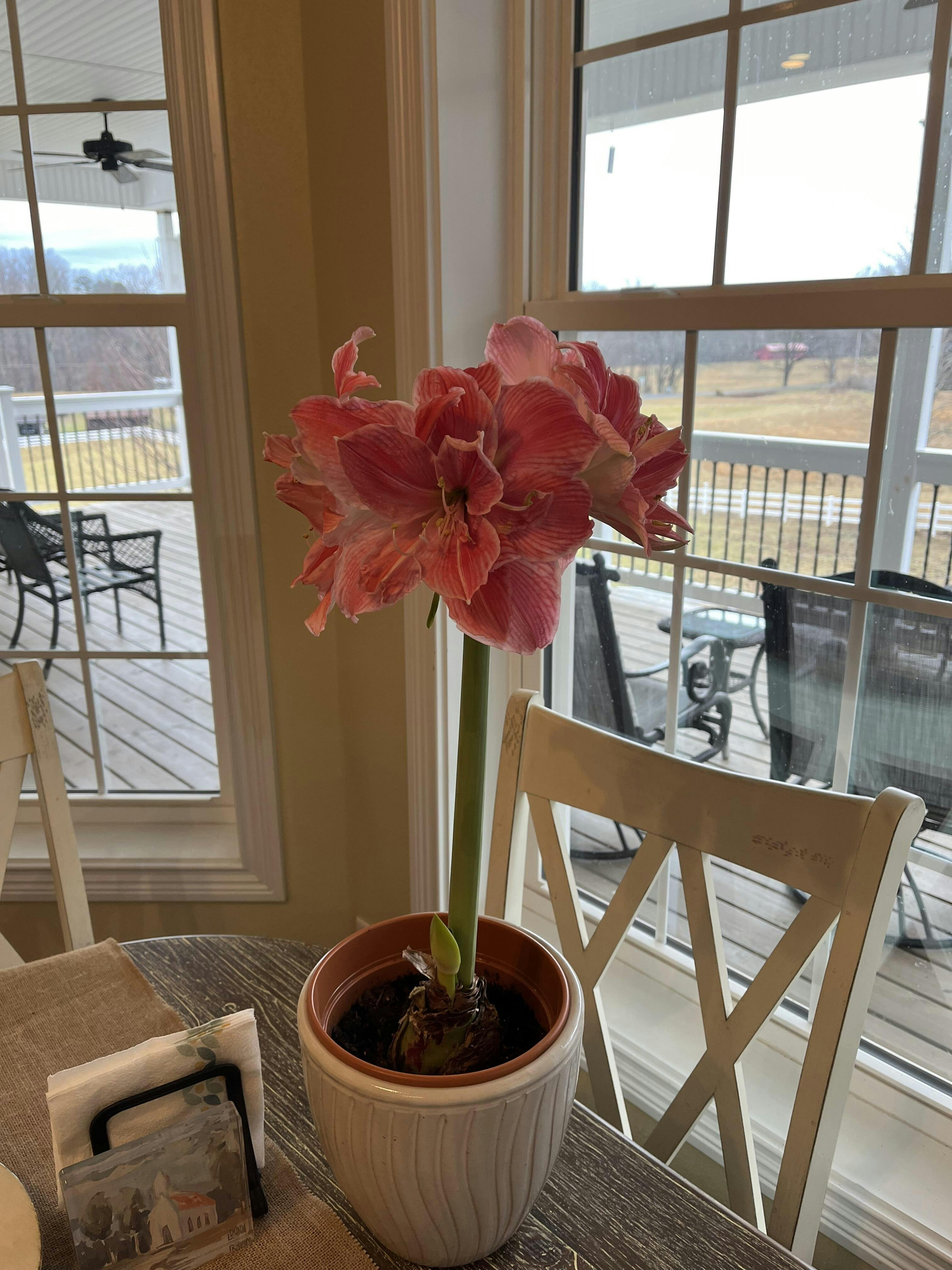 Sweet Nymph is a frilly, double amaryllis with a romantic charm. The flowers have layers of creamy white petals, decorated with coral pink stripes. You'll have fun watching the bulb grow from bud to bloom, and enjoy using them to decorate your home during the winter months.