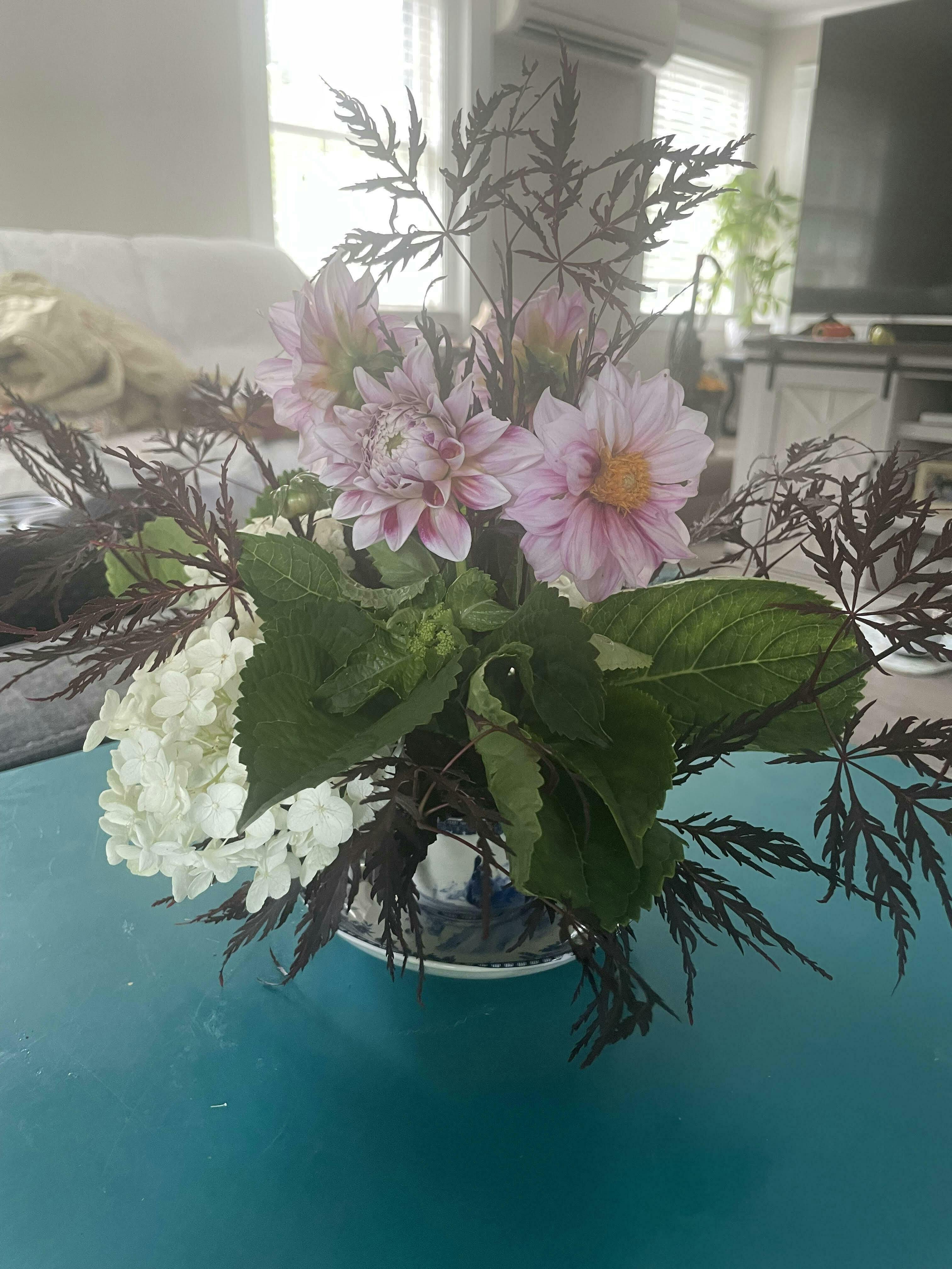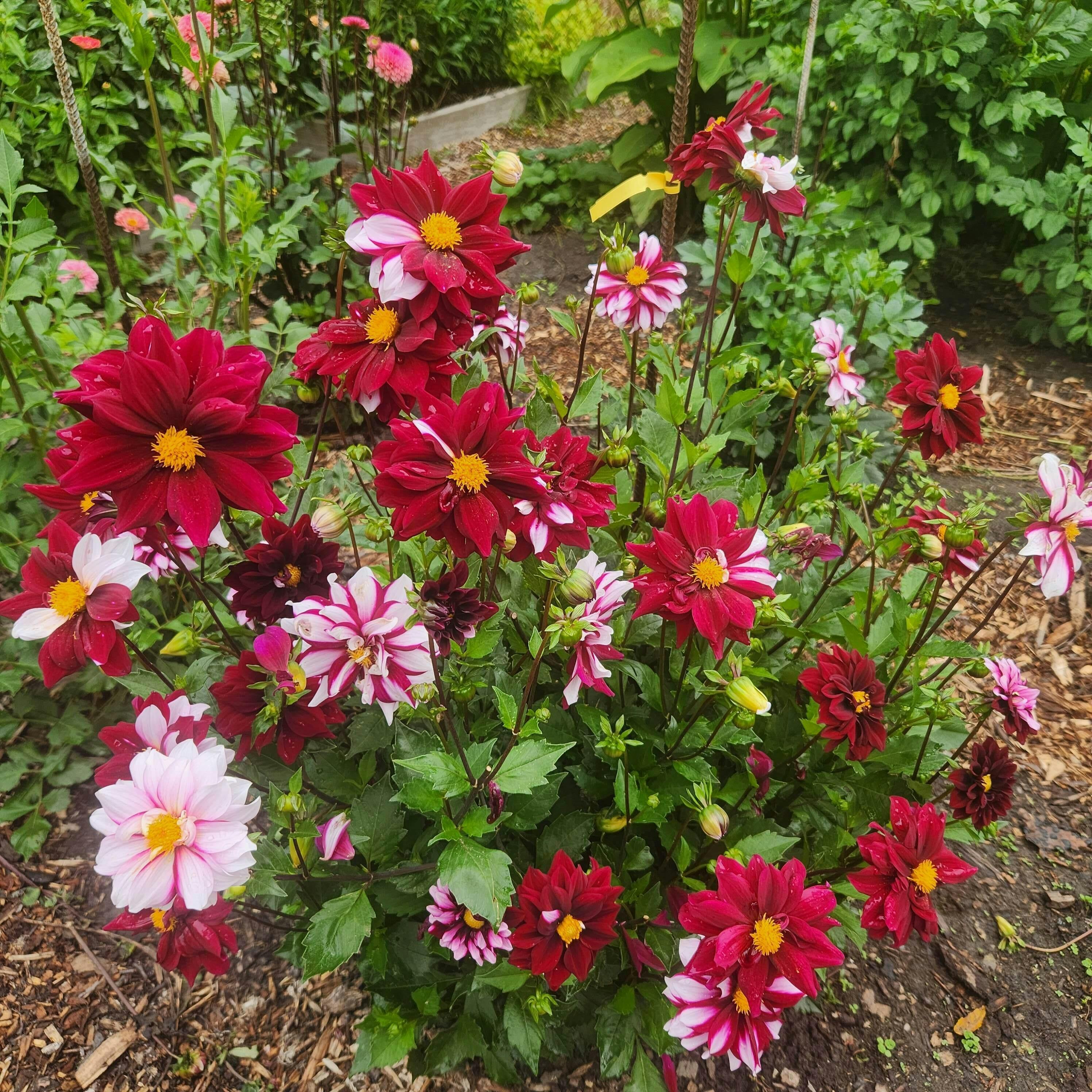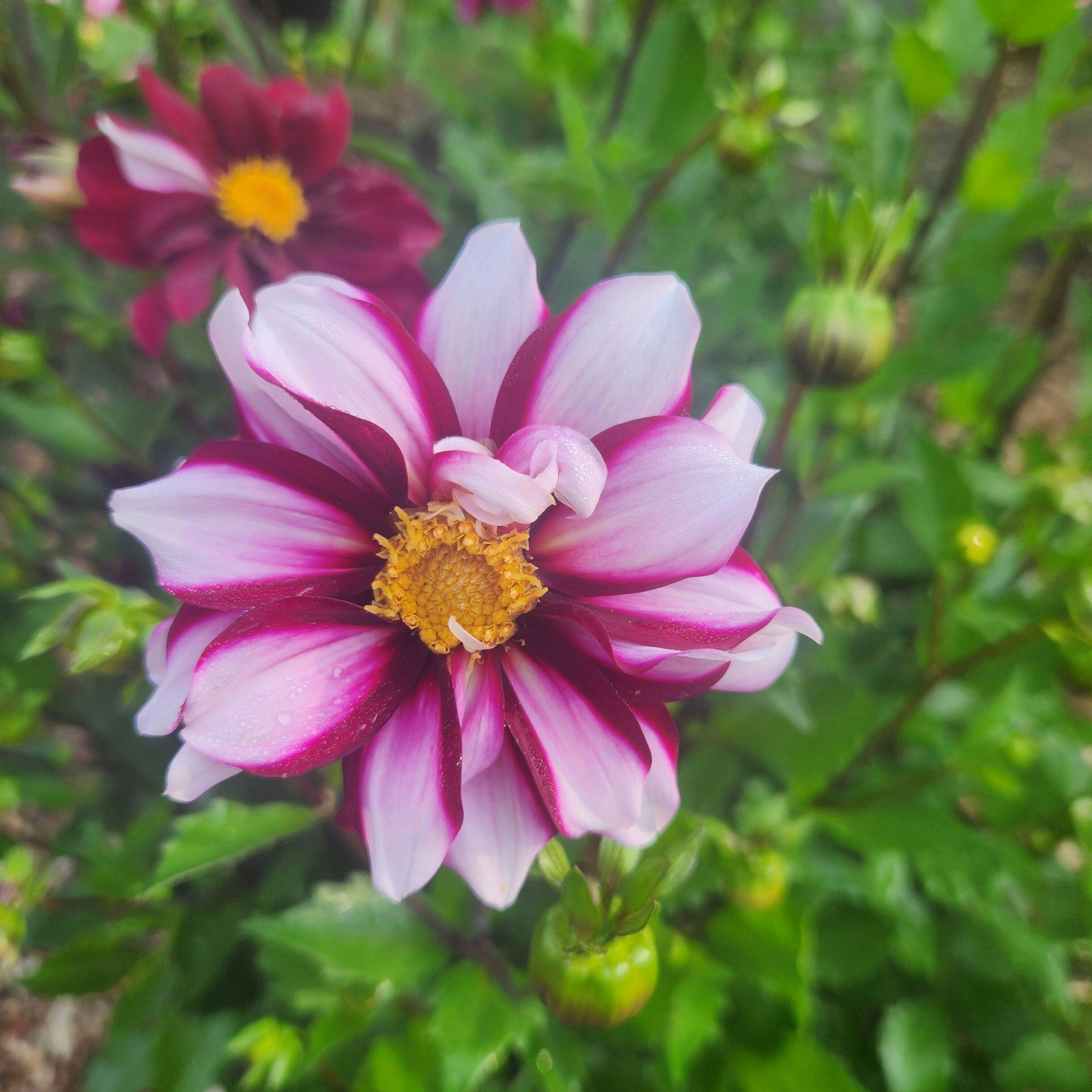 This daisy-like dahlia has a golden yellow center that bees and butterflies can't resist. The two-tone petals are snowy white, flushed with wine red. Edge of Joy is an eyecatcher in the garden, and since it grows just 2-3 tall, it's a good choice for pots and planters.