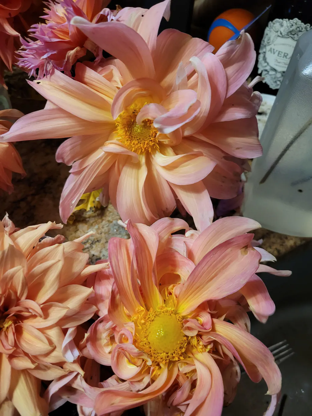 Peach and mango, coral and dusty rose are the must-have colors for today's floral designers. Fairway Spur combines all these lovely hues in each of its flowers. Gently twisted petals give the enormous, 8 to 10" blossoms a casual charm. It takes just a few stems to make a knock-out flower arrangement.