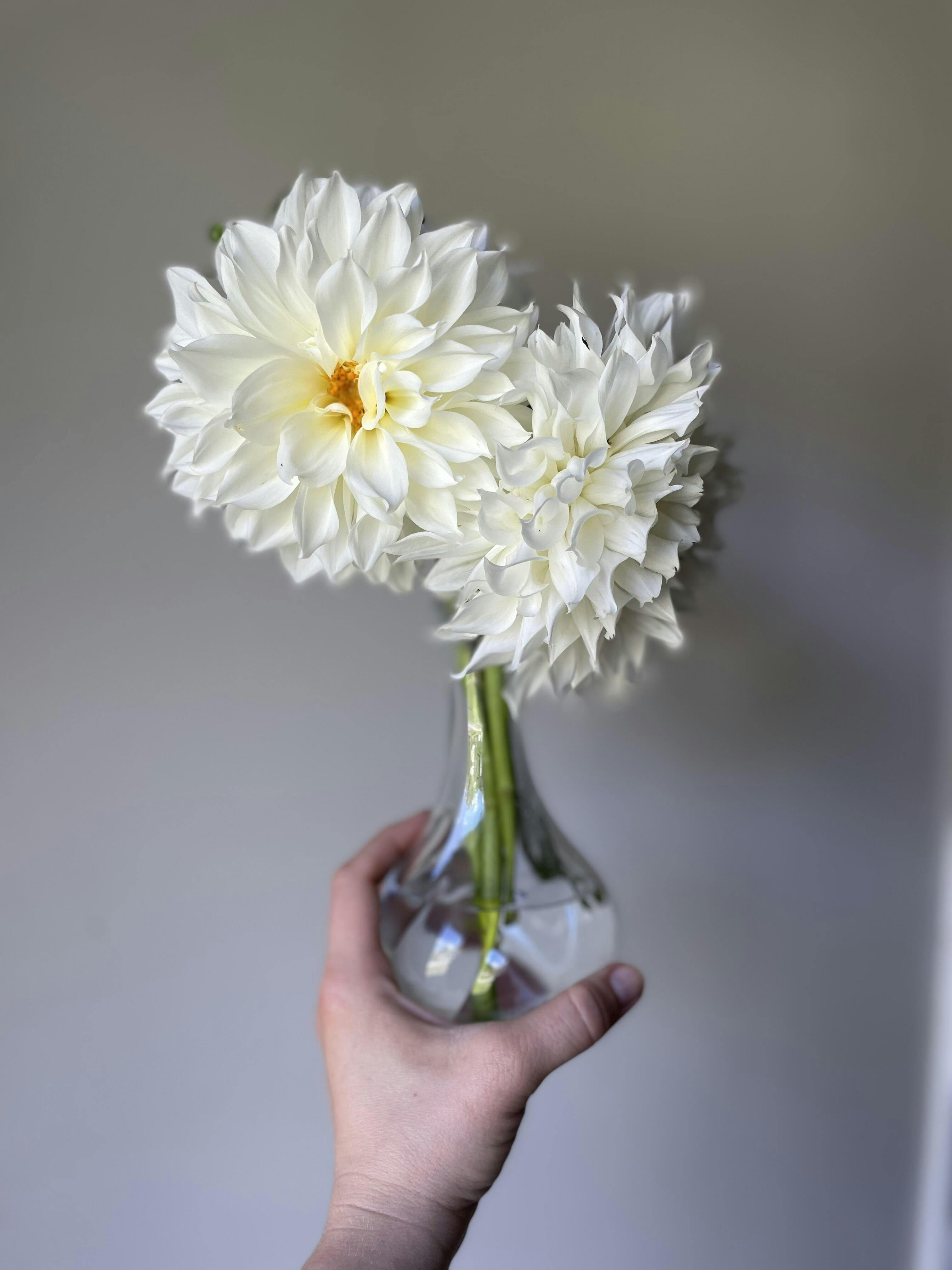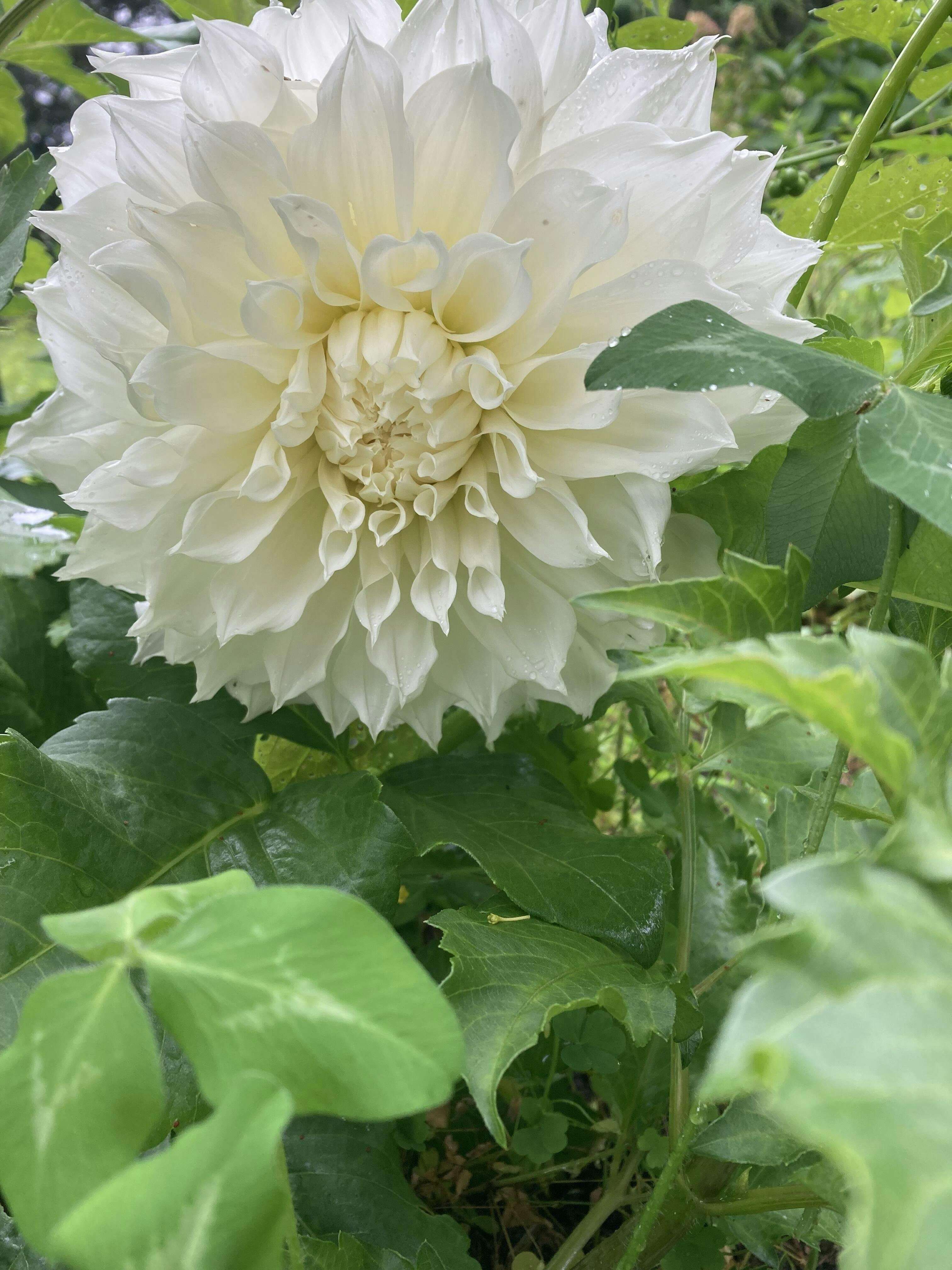 A classic dinnerplate dahlia with pure white blossoms. Gently twisting petals give the flowers a frilly look and a pale yellow center gives them a sunny glow. Each plant produces dozens of blooms so you can enjoy weeks of extravagant bouquets. A great choice for late summer or fall weddings.