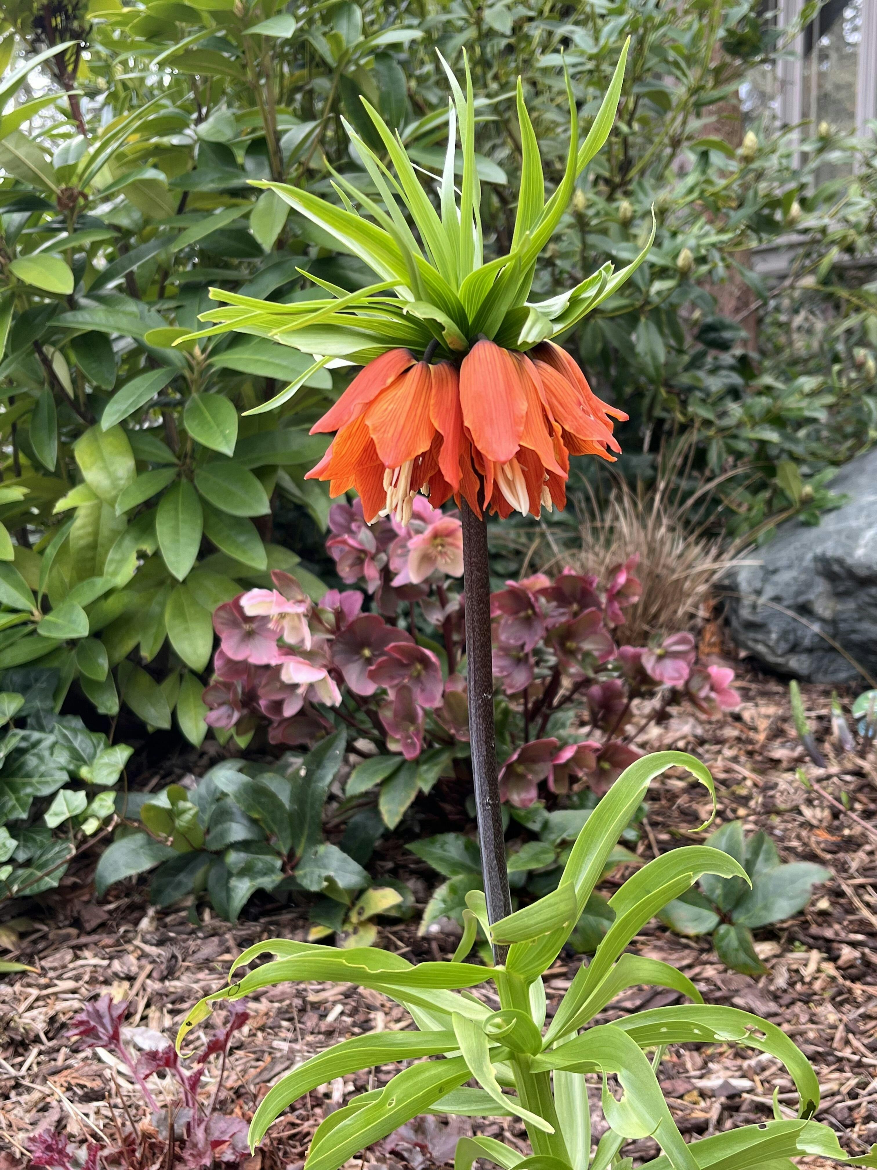 Crown imperials look a bit like pineapples and bring a touch of the exotic to your spring garden. This heirloom favorite features a ring of deep orange bells, crowned with a topknot of shiny green foliage. Sturdy, 2 to 3 ft. stems with attractive lily-like foliage. Blooms in late spring.