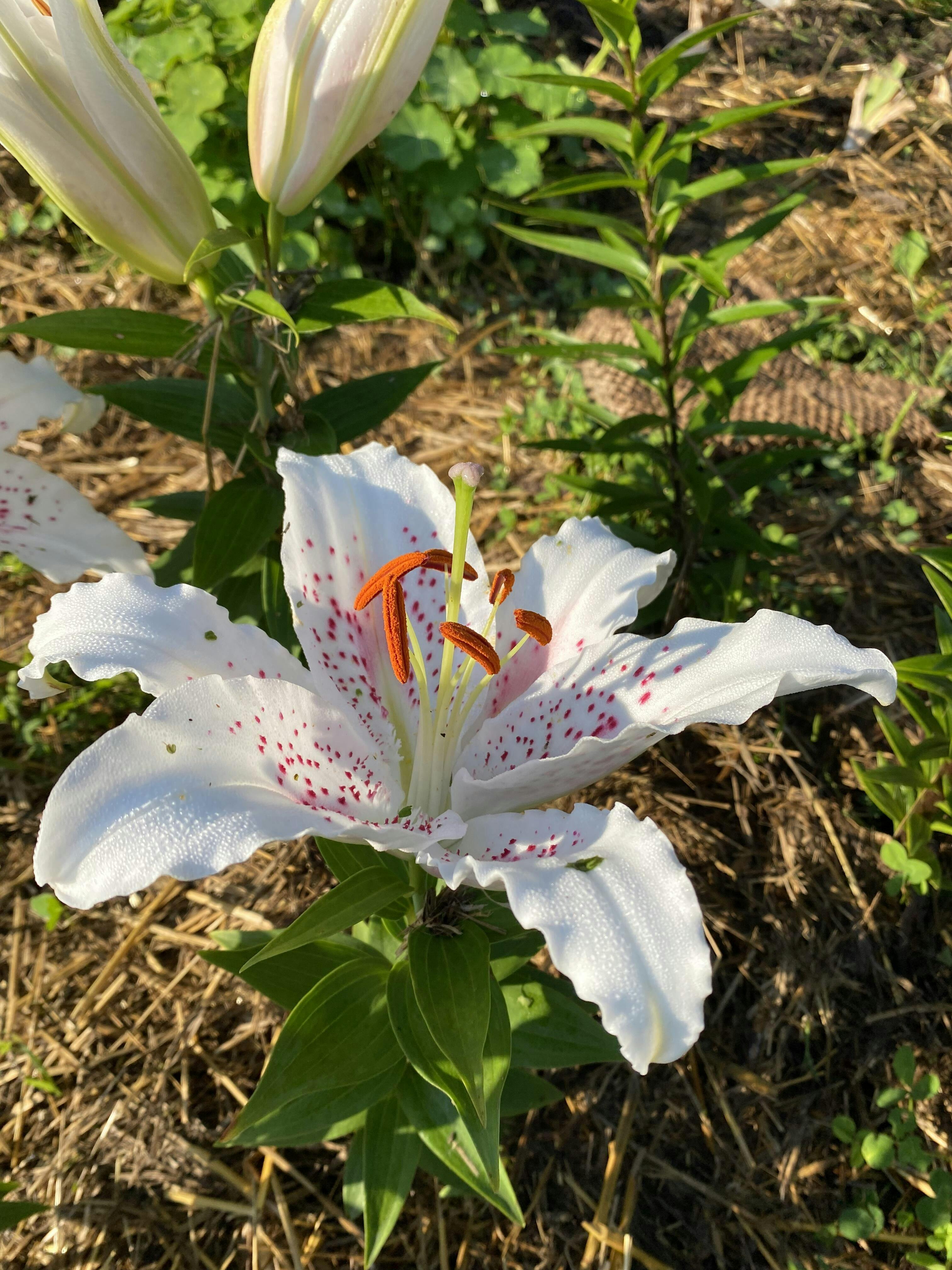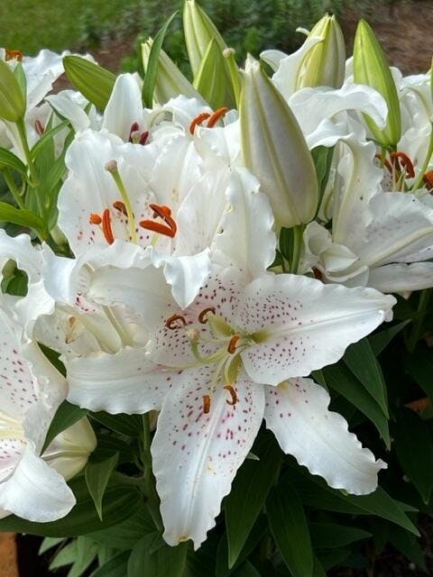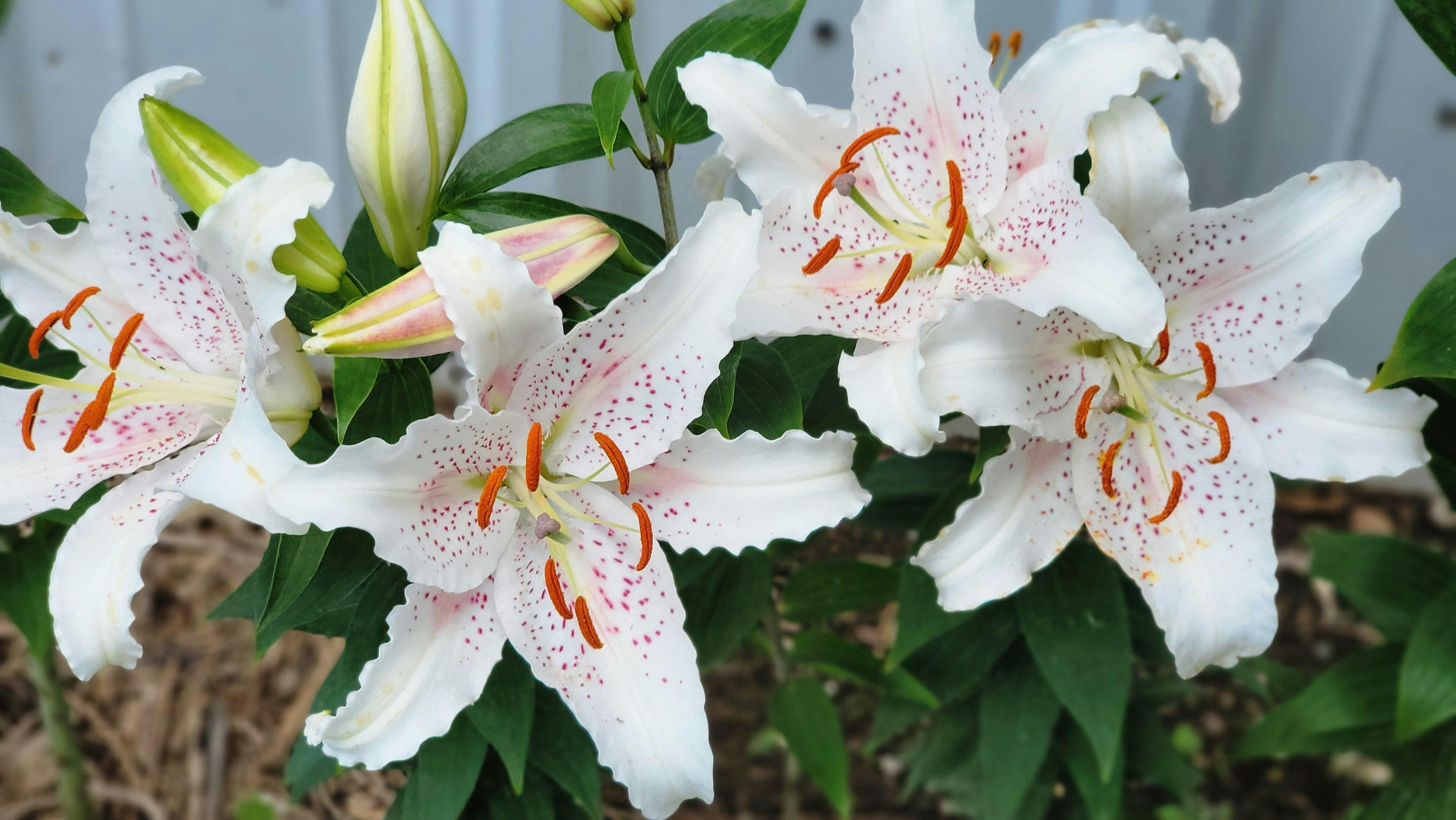 This distinctive Oriental lily has large, snowy-white flowers that open wide to display dark pink freckles and pale pink brushstrokes. Muscadet's lightly ruffled petals, soft pink buds and heady fragrance add to its sweetness.