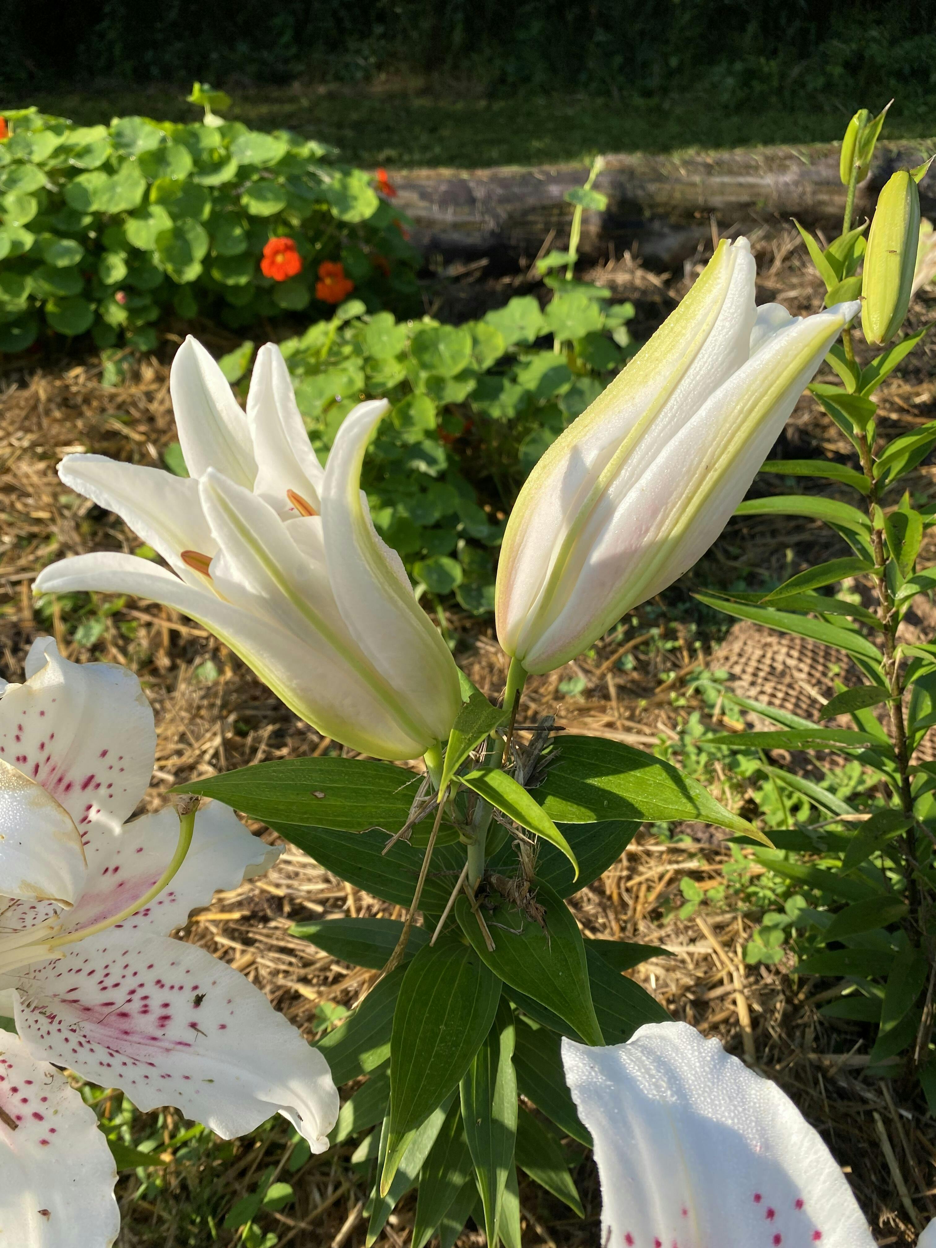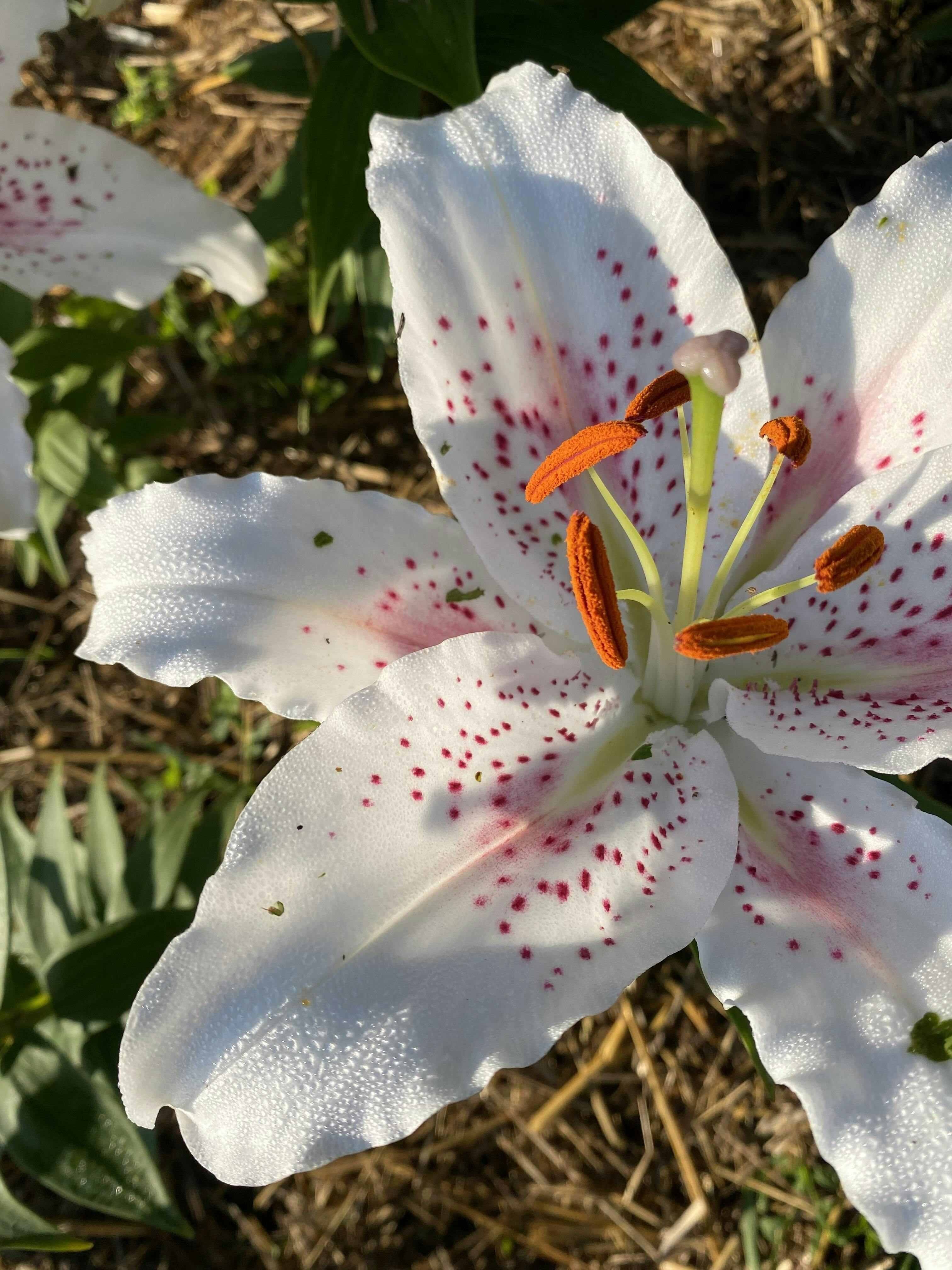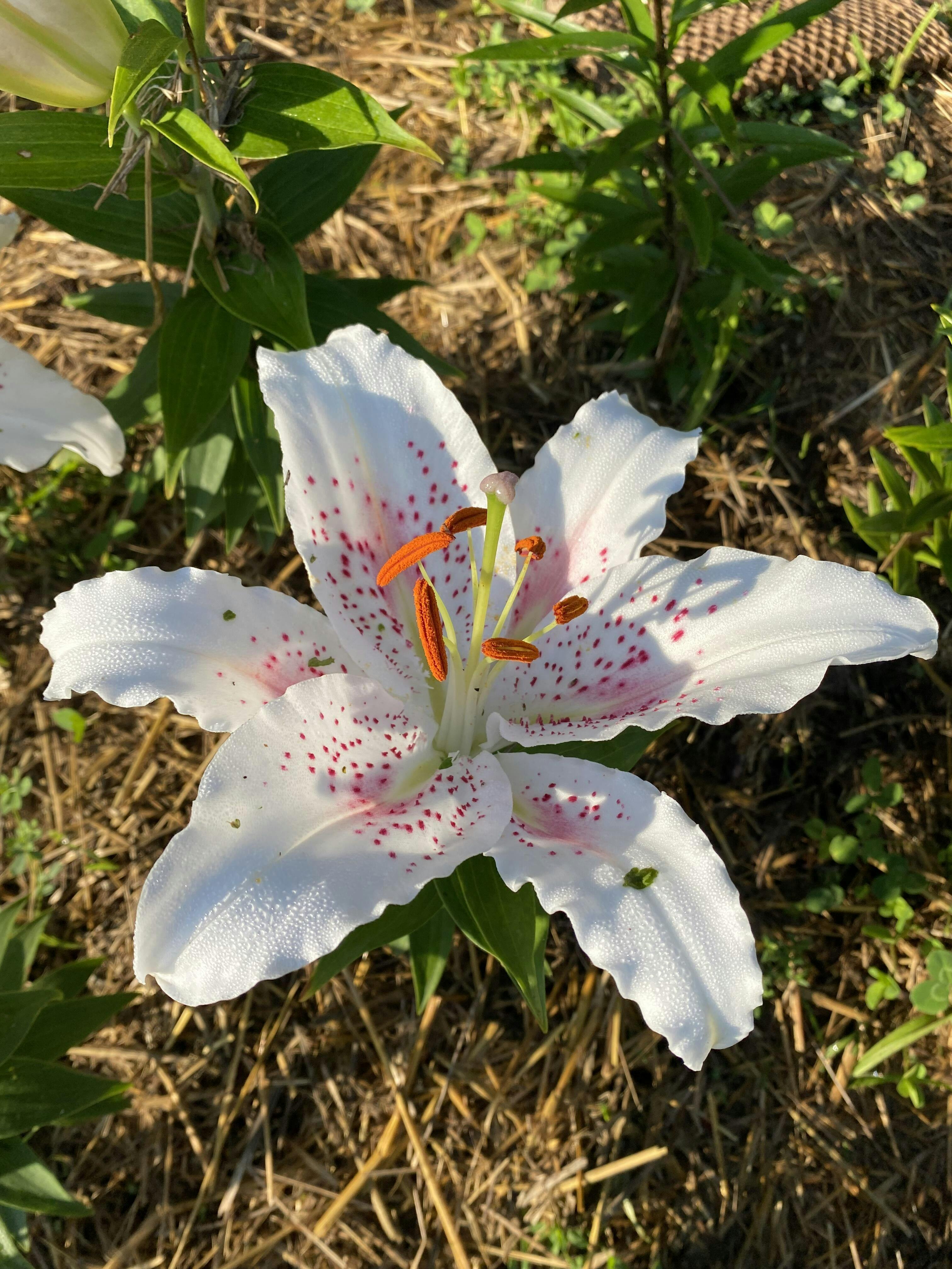 This distinctive Oriental lily has large, snowy-white flowers that open wide to display dark pink freckles and pale pink brushstrokes. Muscadet's lightly ruffled petals, soft pink buds and heady fragrance add to its sweetness.