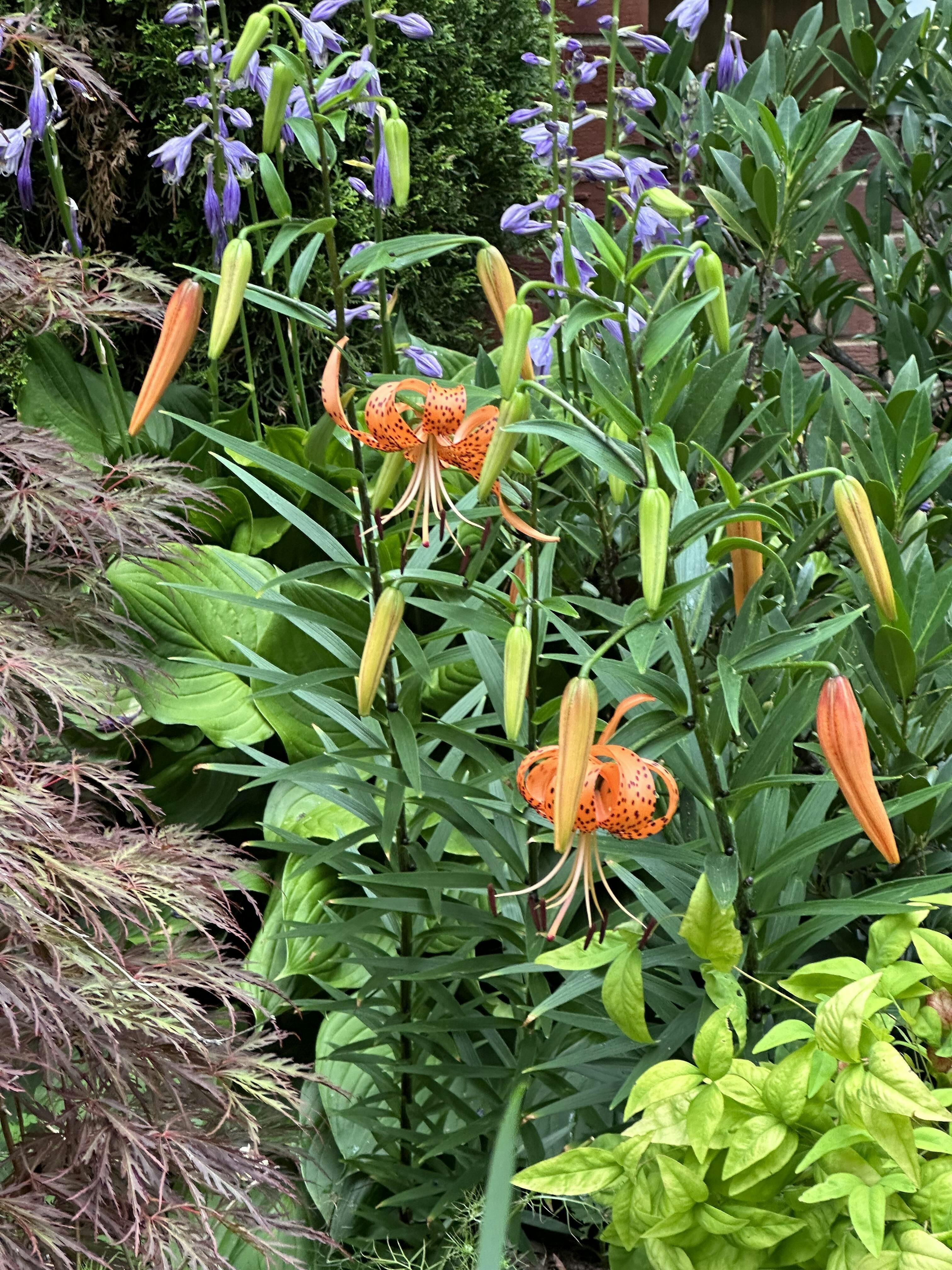 Though tiger lilies are native to Asia, they can now be found growing wild in New England and other parts of the east coast. The distinctive flowers are easy to recognize: bright orange, recurved petals with black freckles and long stamens. Shiny black bulbils line the stalks. The bulbs are good perennializer, so you'll enjoy them for years to come.
