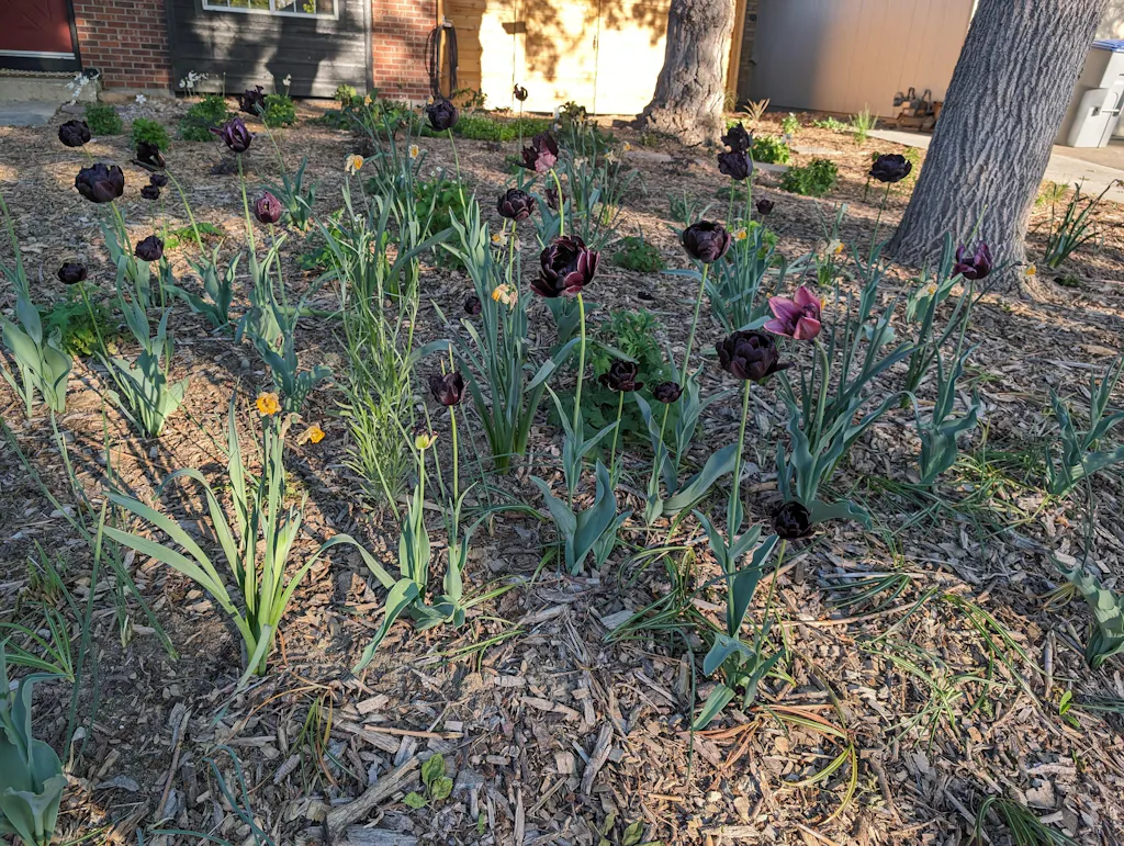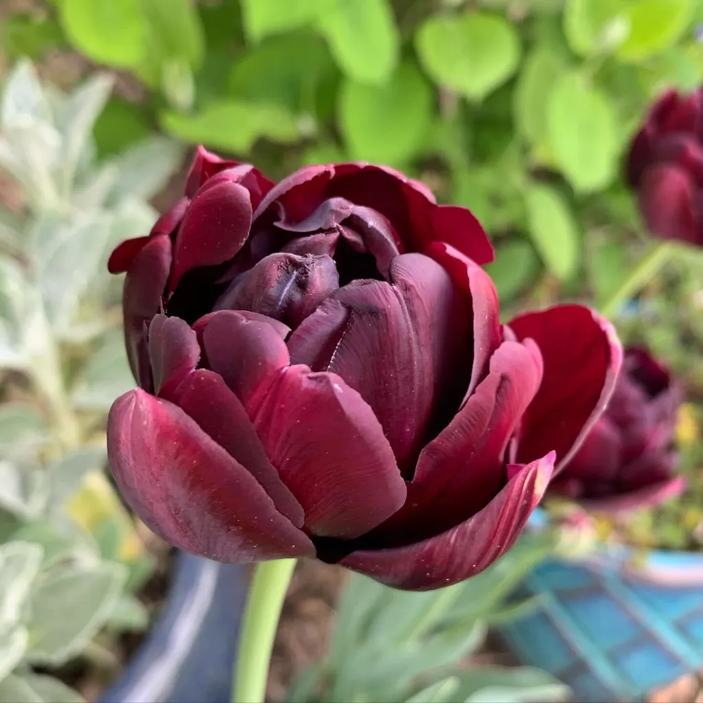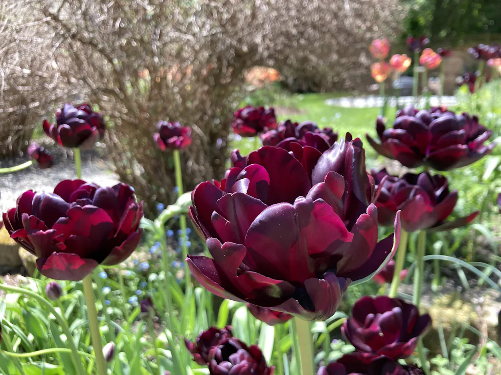 With its glossy maroon petals and peony-like flowers, Black Hero adds drama to any spring garden. This double version of Queen of Night is equally reliable, tall, and long-blooming. It's a stunning companion for brights or pastels, and a sophisticated partner for white or cream.