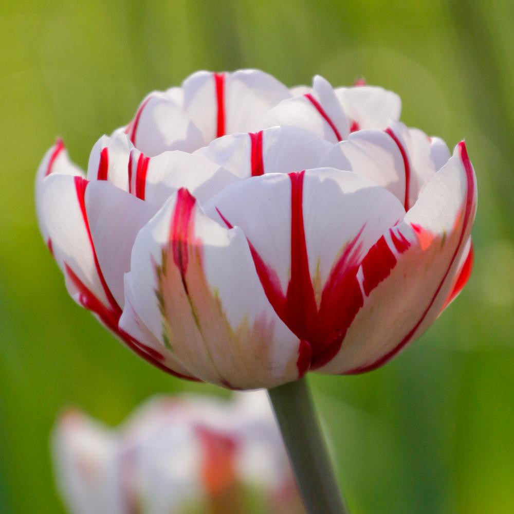 This classic, late-blooming tulip has stood the test of time and captured generations of admirers. The blossoms are extra large and beautifully cupped, with glistening white petals that are decorated with scarlet red stripes and flames. On sunny days, the petals open wide to reveal a lemon yellow center. Foliage has cream-colored edges.