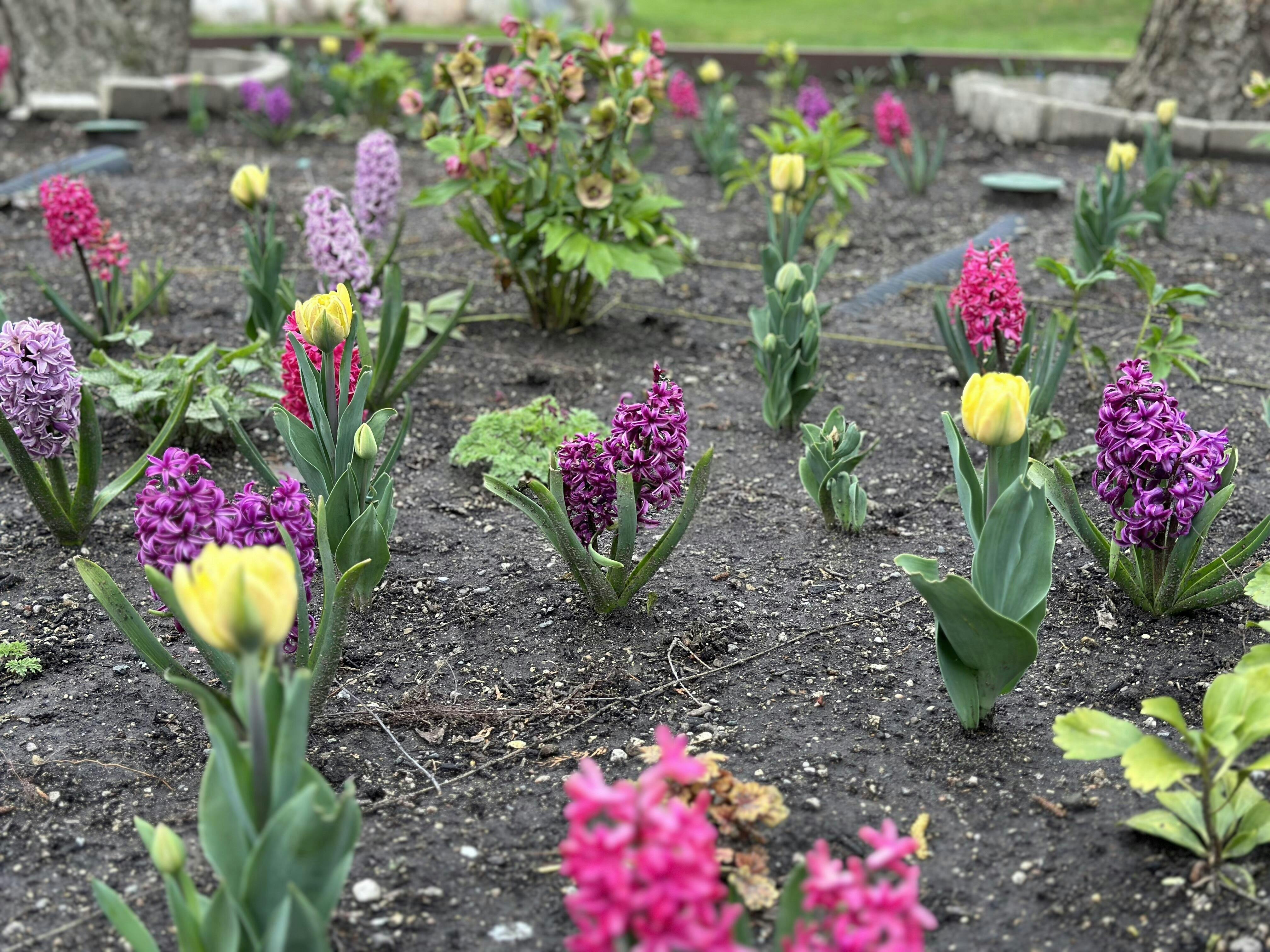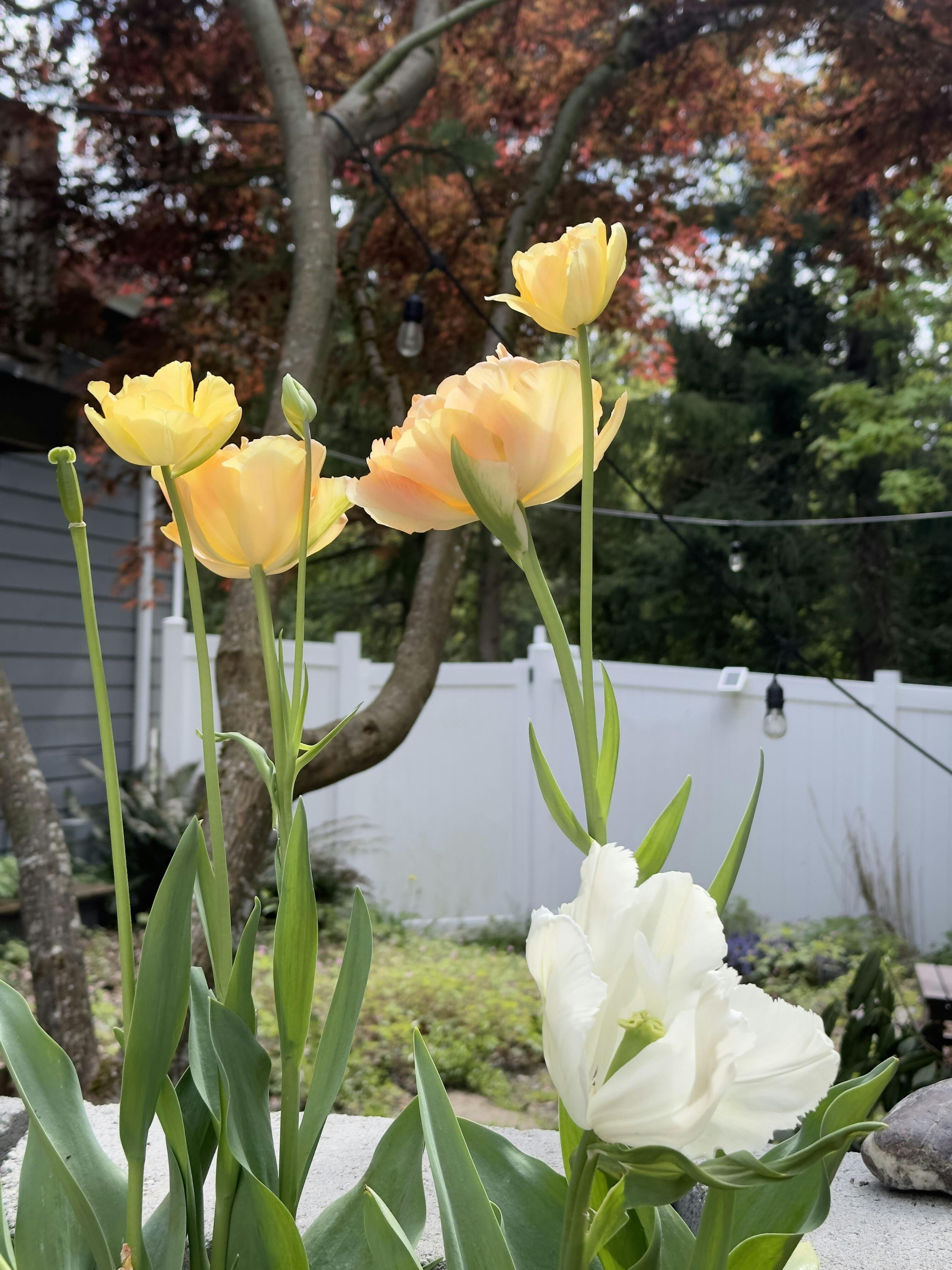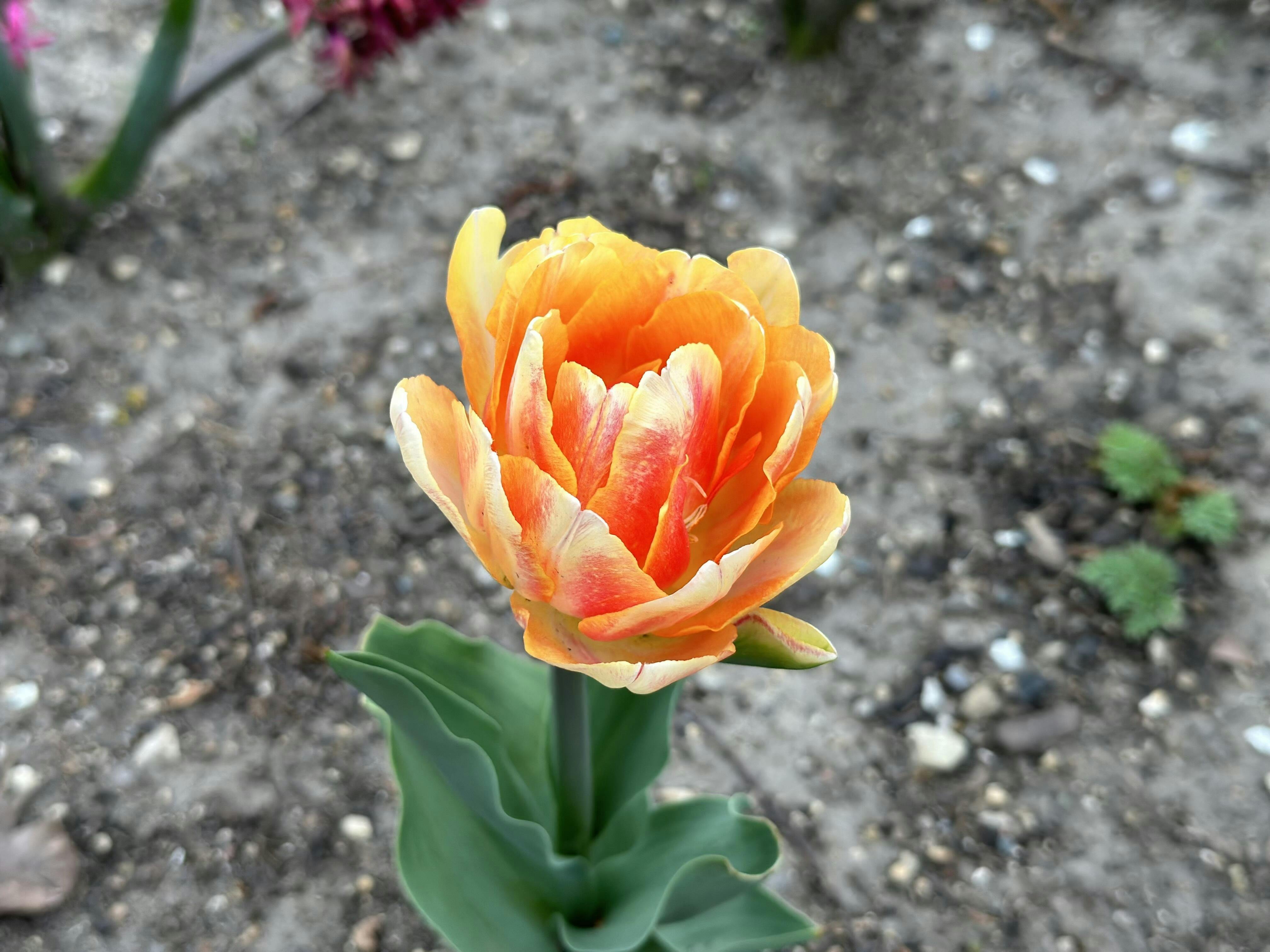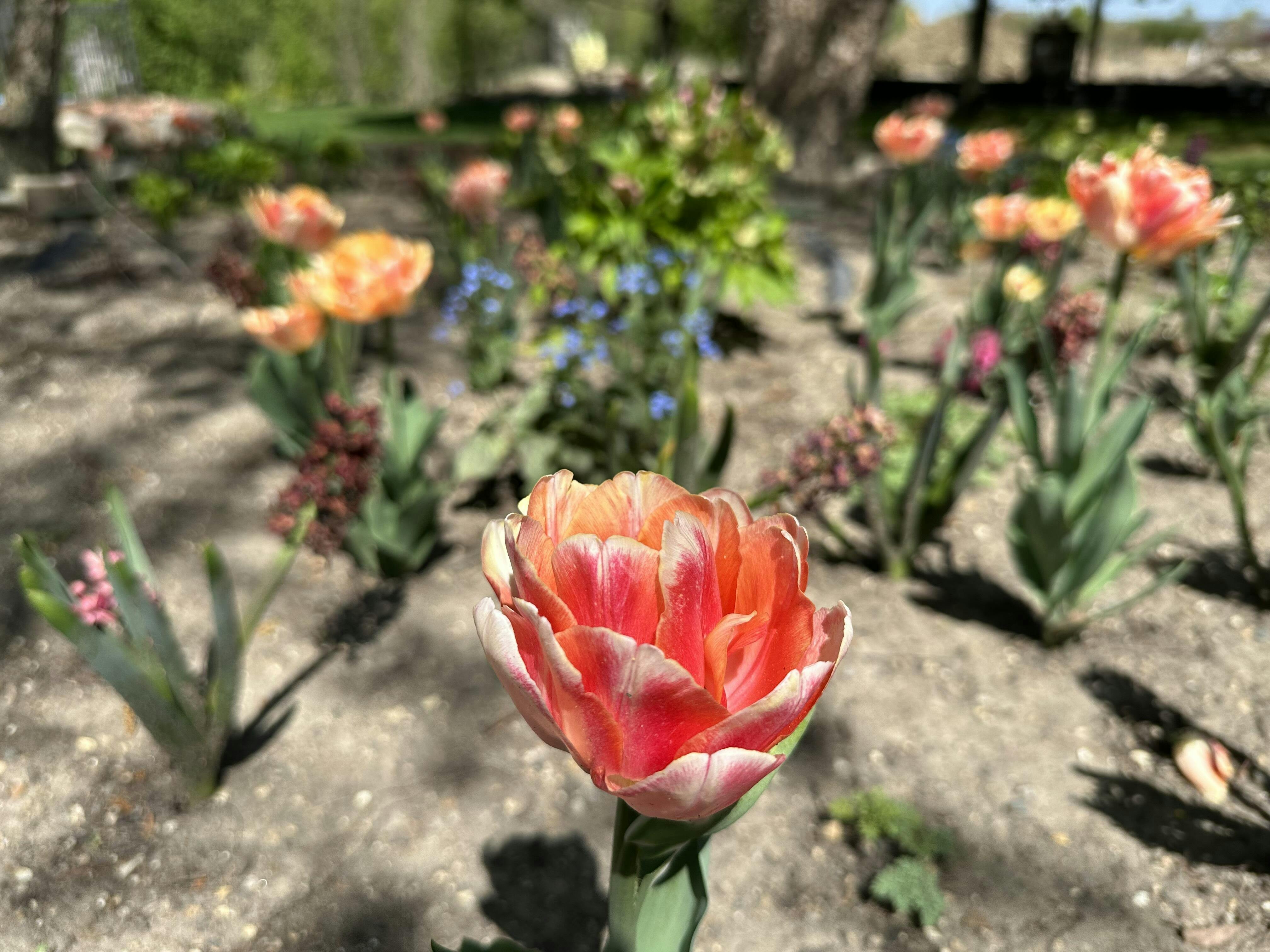 This double early tulip is always a favorite in our trial garden. Foxy Foxtrot's ruffled petals are a breathtaking harmony of honey-gold, apricot and peach. We have paired this tulip with purples, with pinks, and with reds. It works beautifully every time. Makes a gorgeous cut flower, too.